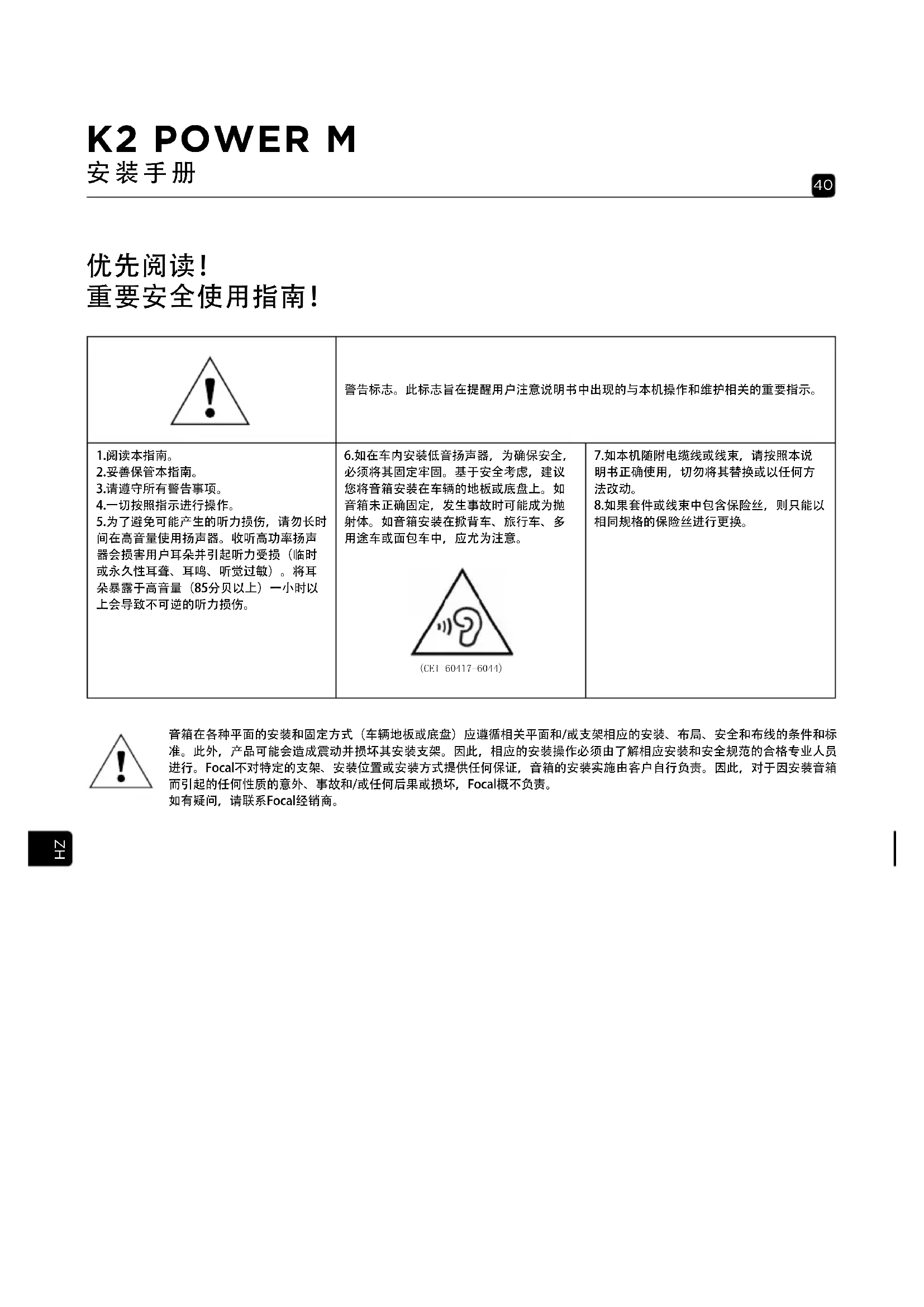 8.如果套件或线束中包含保险丝,则只能以 相同规格的保险丝进行更换。 (CEI 60417-6044) 音箱在各种平面的安装和固定方式(车辆地板或底盘)应遵循相关平面和/或支架相应的安装、布局、安全和布线的条件和标 准。此外,产品可能会造成震动并损坏其安装支架。因此,相应的安装操作必须由了解相应安装和安全规范的合格专业人员 进行。Focal不对特定的支架、安装位置或安装方式提供任何保证,音箱的安装实施由客户自行负责。因此,对于因安装音箱 而引起的任何性质的意外、事故和/或任何后果或损坏,Focal概不负责。 如有疑问,请联系Focal经销商。