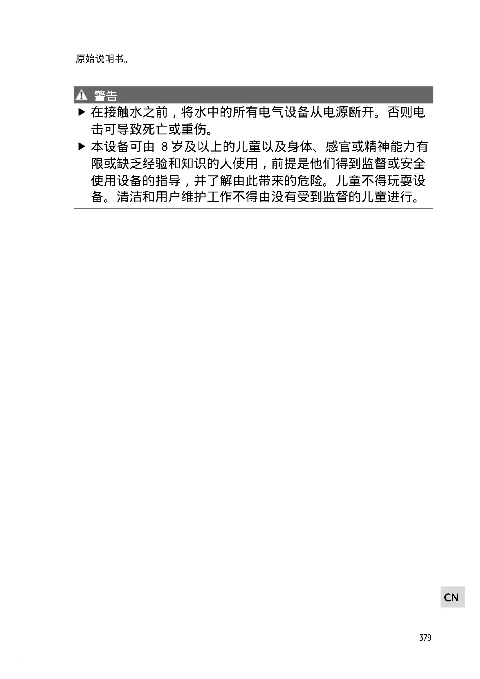 本设备可由 8 岁及以上的儿童以及身体、感官或精神能力有 限或缺乏经验和知识的人使用,前提是他们得到监督或安全 使用设备的指导,并了解由此带来的危险。儿童不得玩耍设 备。清洁和用户维护工作不得由没有受到监督的儿童进行。380