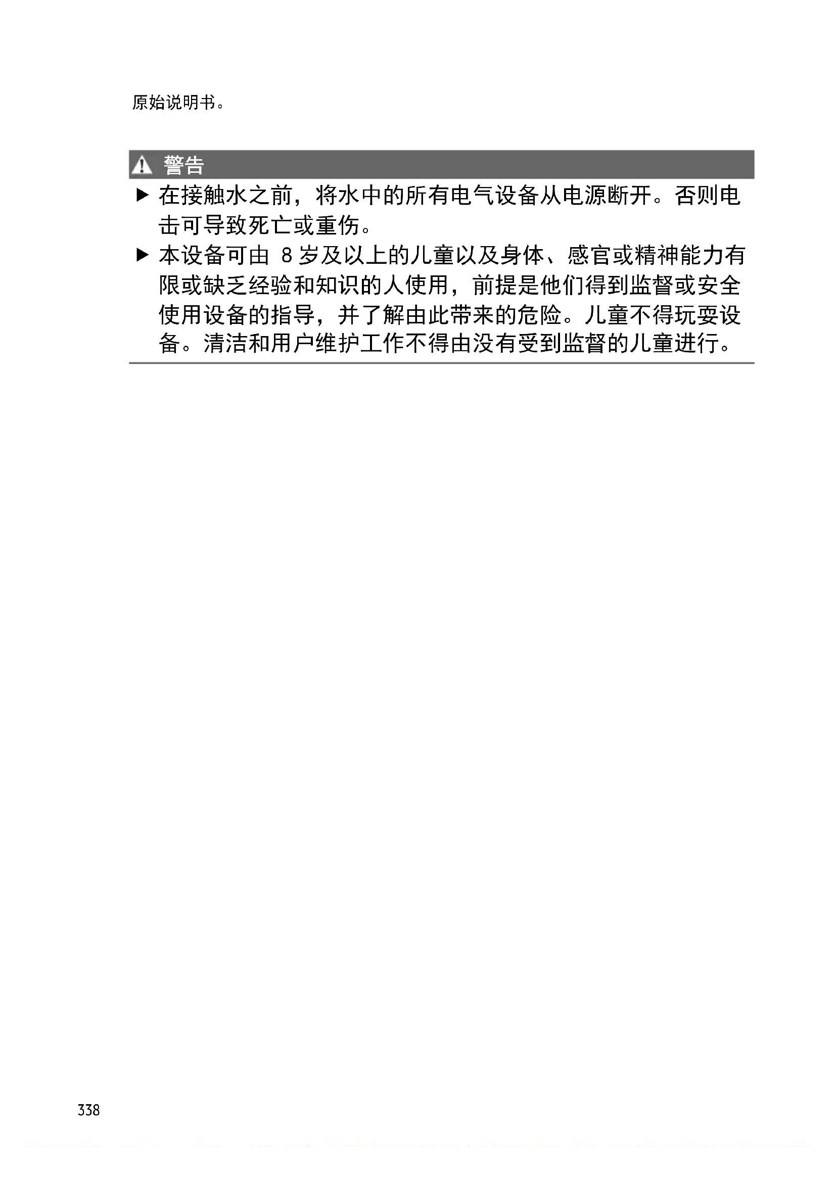 在游泳池中运行设备时可导致重伤或死亡。电气设备零件损坏将使水处于危险电压