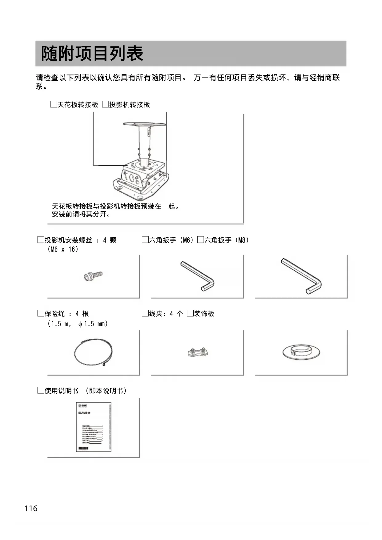 Y 投影机安装螺丝 : 4 颗 (M6 x 16) Y 六角扳手 (M6) Y 六角扳手 (M8) Y 保险绳 : 4 根 (1.5 m, φ 1.5 mm) Y 线夹:4 个 Y 装饰板 Y 使用说明书 (即本说明书) Y 天花板转接板 Y 投影机转接板 天花板转接板与投影机转接板预装在一起。