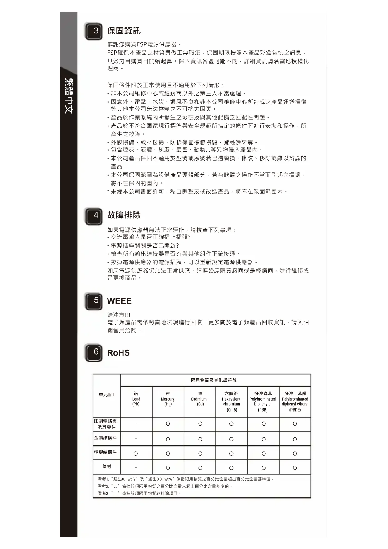 FSP確保本產品之材質與做工無瑕疵,保固期限按照本產品彩盒包裝之訊息,其效力自購買日開始起算。保固資訊各區可能不同,詳細資訊請洽當地授權代理商。
