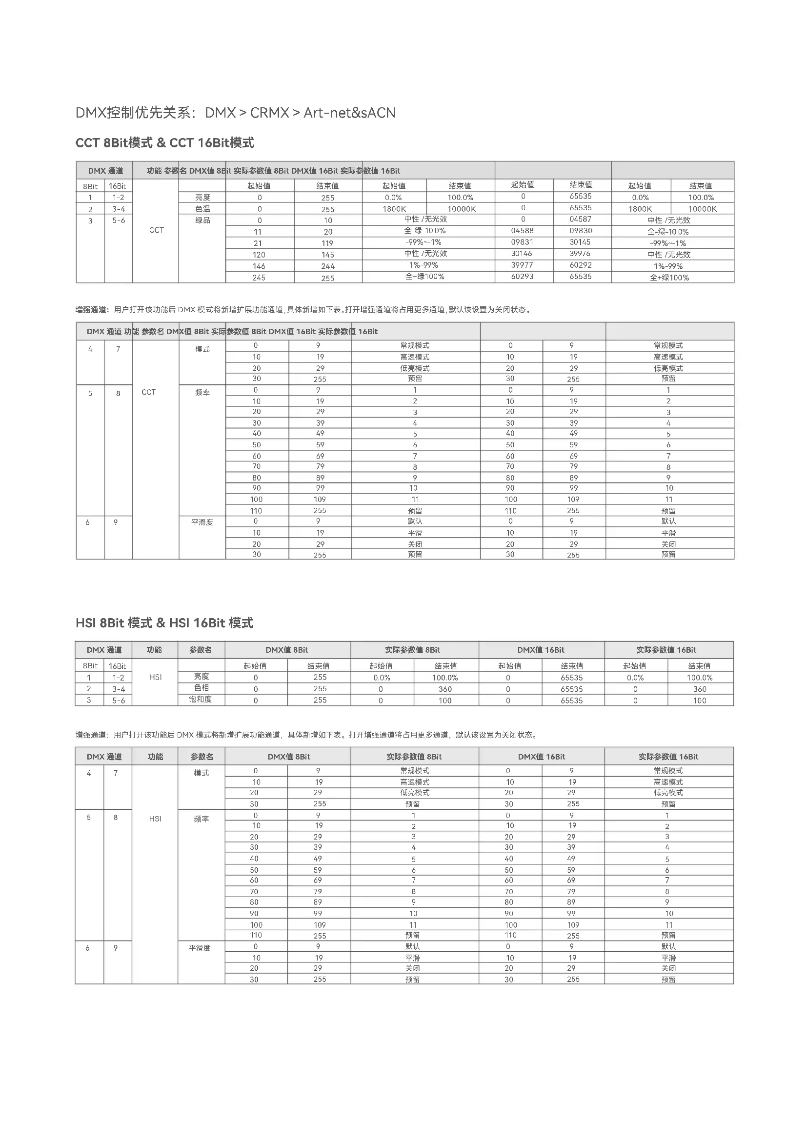 100.0% 100.0% 100.0% 100.0% 功能 参数名 DMX值 8Bit 实际参数值 8Bit CCT + HSI 8Bit 模式 DMX 通道 8Bit