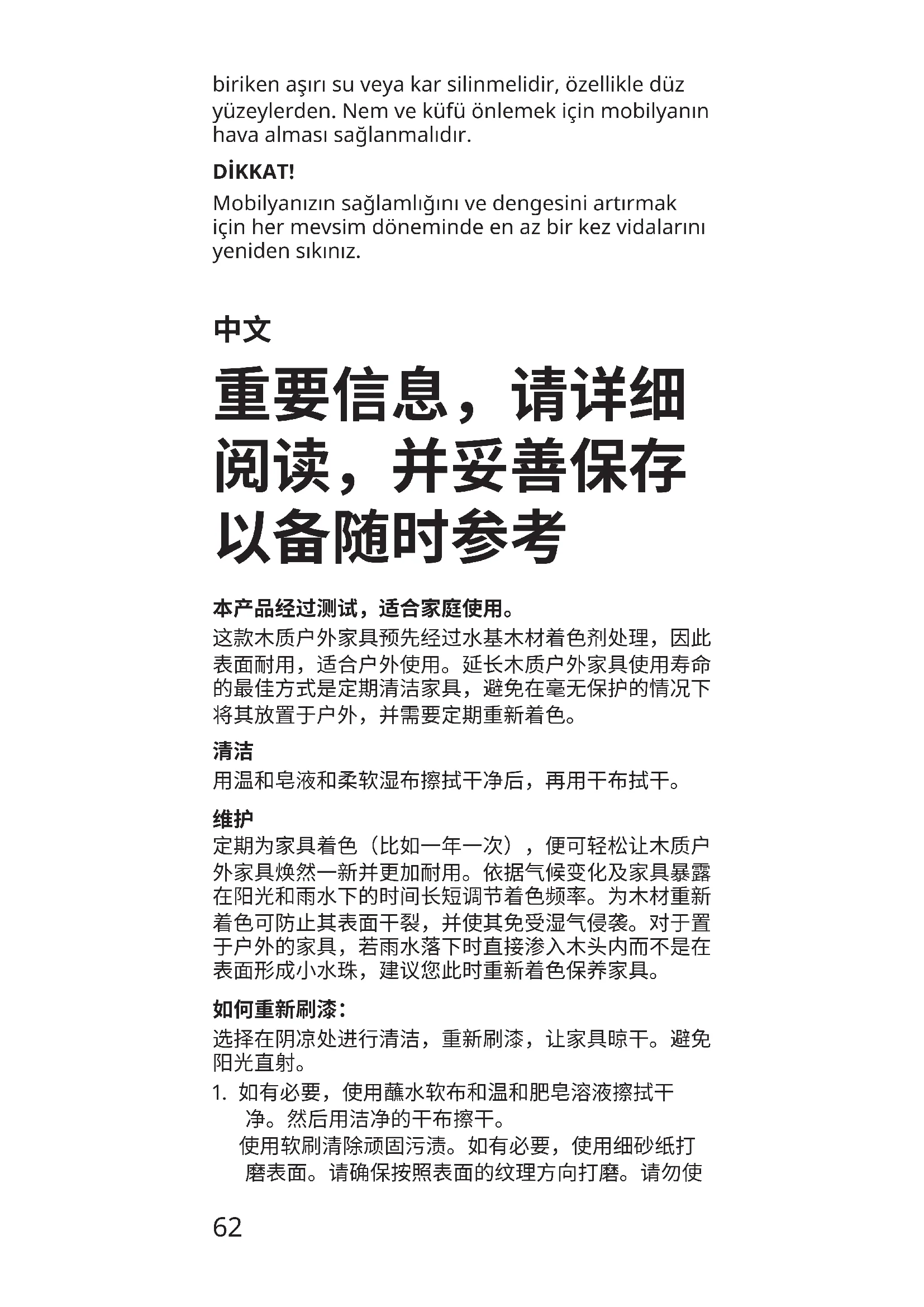 本产品经过测试,适合家庭使用。 这款木质户外家具预先经过水基木材着色剂处理,因此 表面耐用,适合户外使用。延长木质户外家具使用寿命 的最佳方式是定期清洁家具,避免在毫无保护的情况下 将其放置于户外,并需要定期重新着色。
