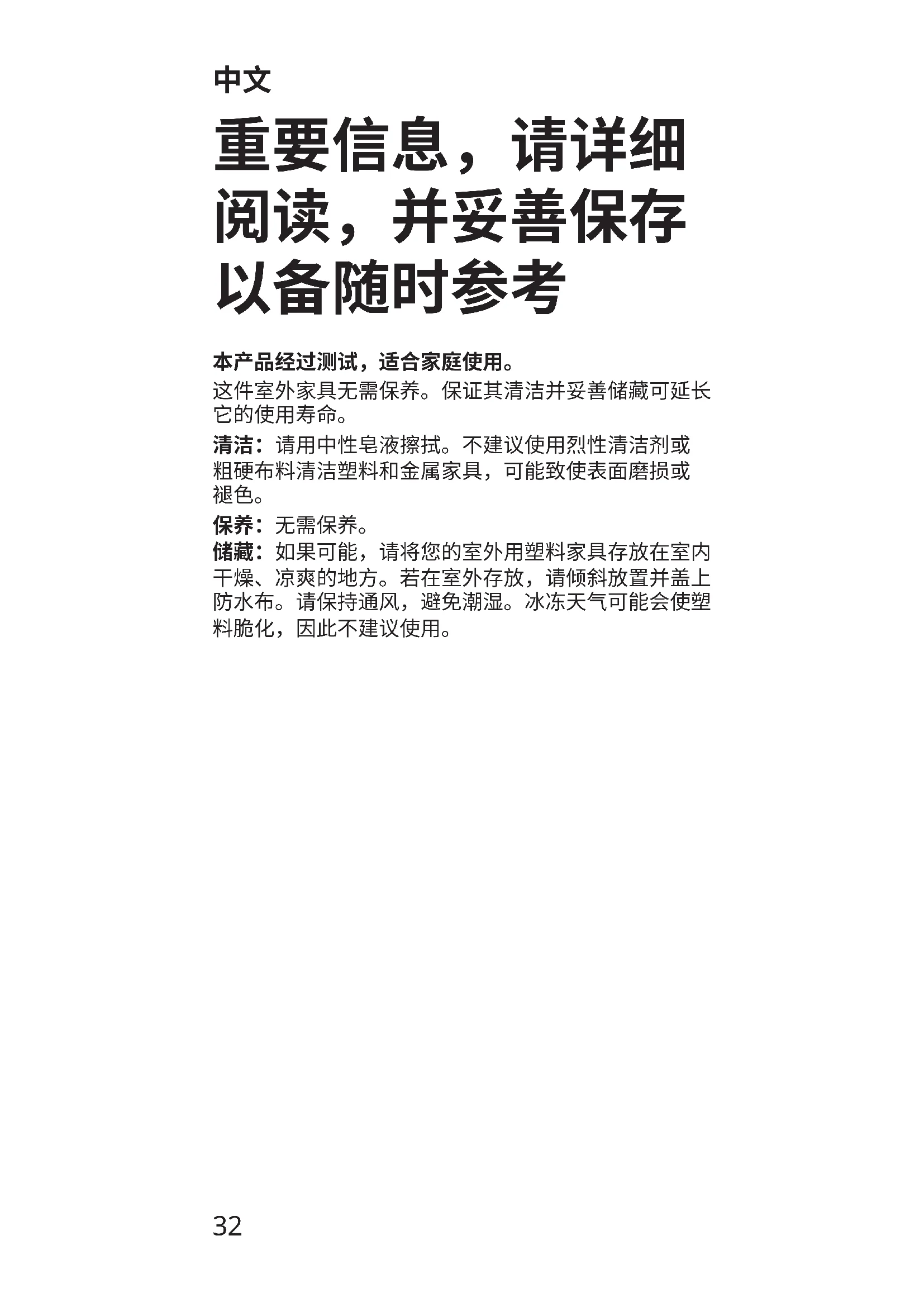储藏:如果可能,请将您的室外用塑料家具存放在室内 干燥、凉爽的地方。若在室外存放,请倾斜放置并盖上 防水布。请保持通风,避免潮湿。冰冻天气可能会使塑 料脆化,因此不建议使用。33