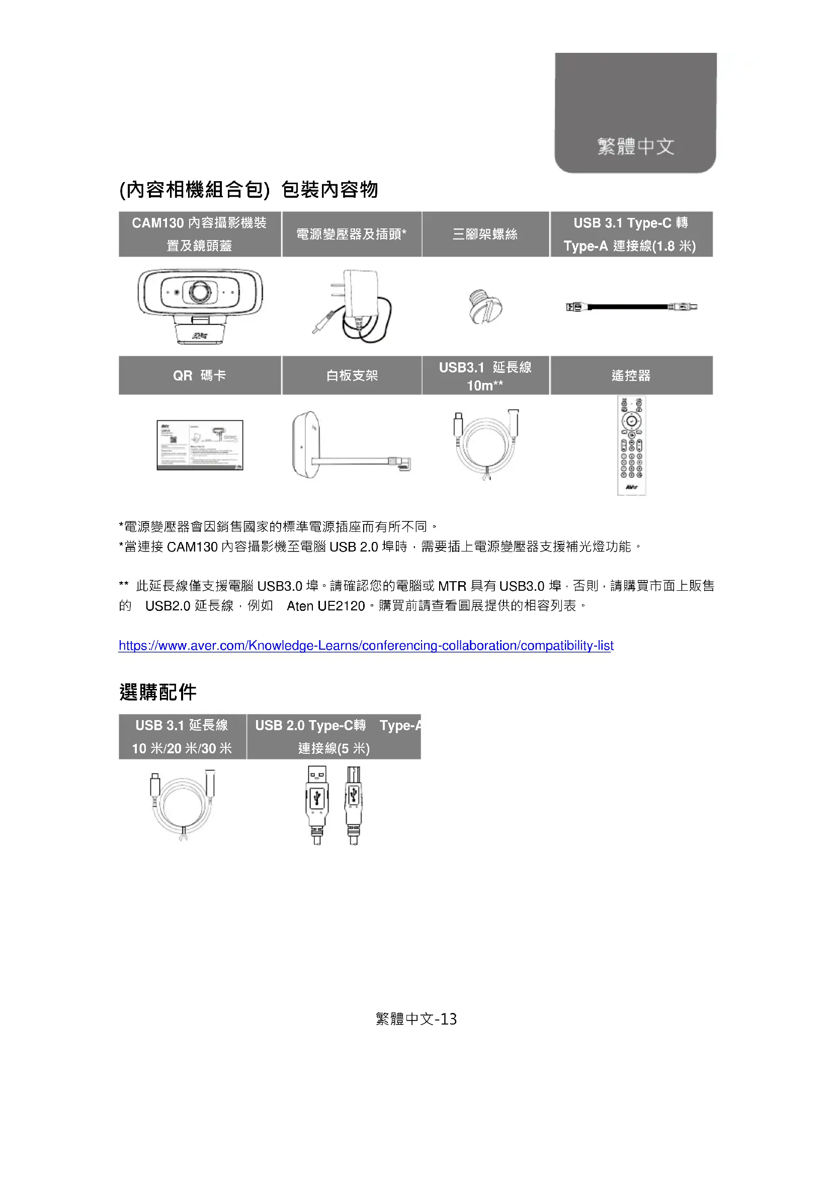 https://www.aver.com 新北市 23673 土城區大安路 157 號 8 樓 電話:(02)2269-8535简体中文-24 (内容相机组合包) 包装内容物 CAM130 内容摄影机装