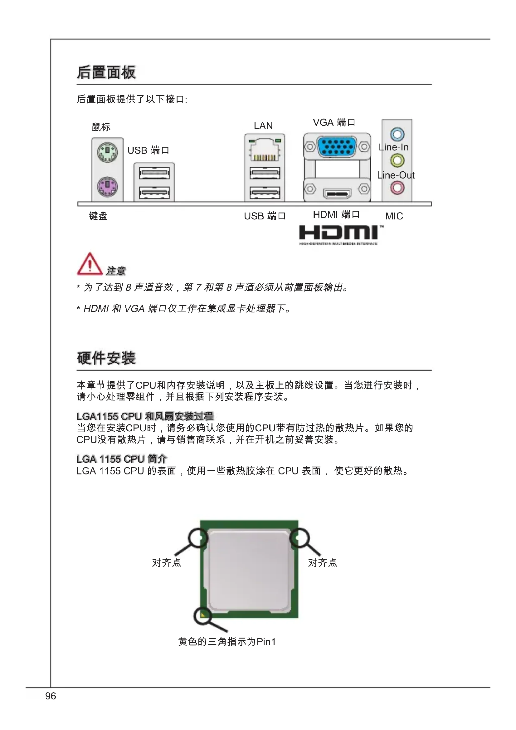 为了达到 8 声道音效,第 7 和第 8 声道必须从前置面板输出。 HdMI 和 VGA 端口仅工作在集成显卡处理器下。