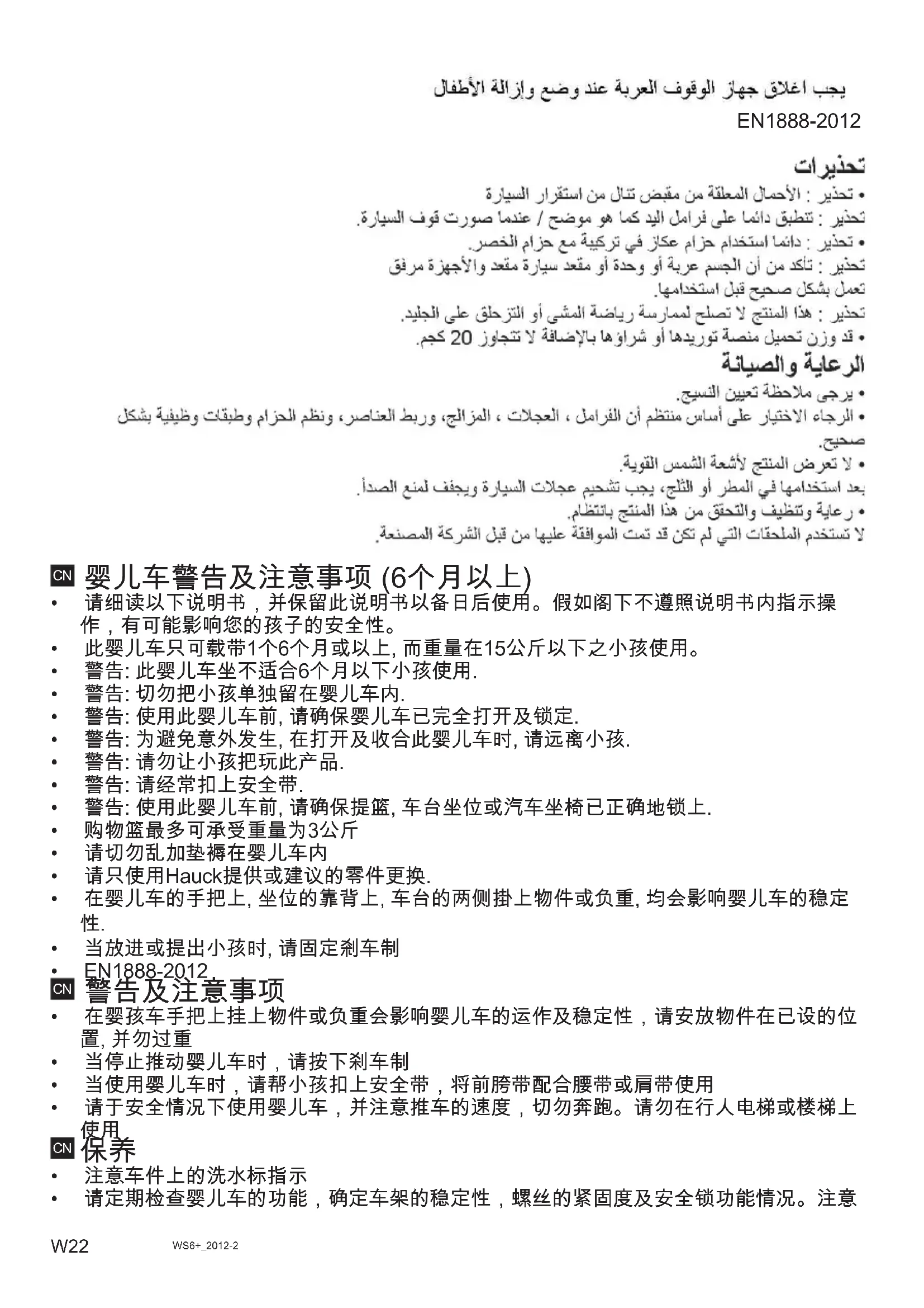- 请定期检查婴儿车的功能,确定车架的稳定性,螺丝的紧固度及安全锁功能情况。注意 EN1888-2012W23 轮胎及刹车制是否操作正常。