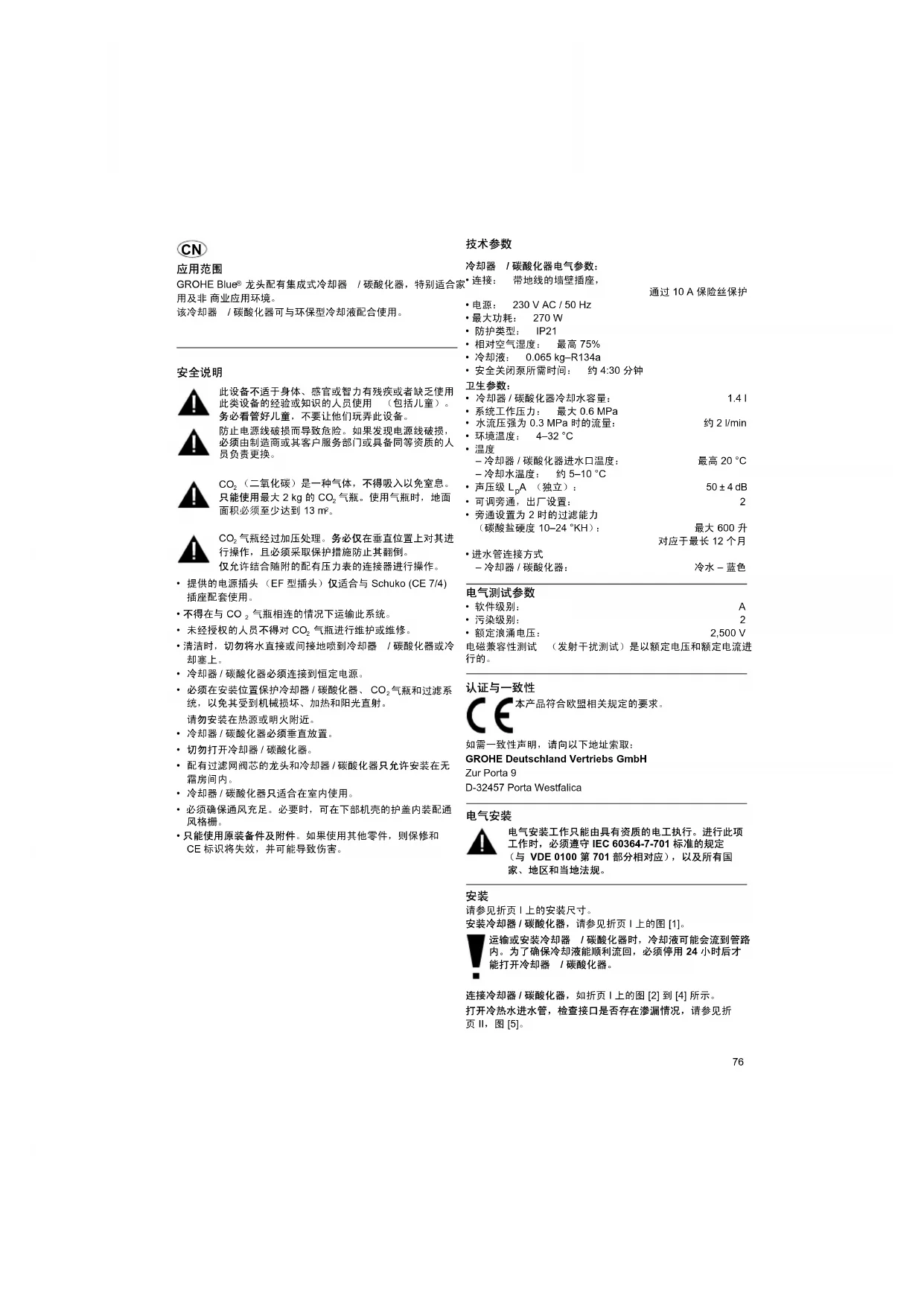 给。 然后才可以断开插入式连接器, 请参见折页 II 中的图 [6] 和 [7]。 检查和清洁所有部件,根据需要更换部件。 安装时请按照相反的顺序进行。78 清洁冷却器 / 碳酸化器 出于卫生和健康方面的考虑,冷却器 / 碳酸化器必须每年 清洁一次。清洁工作必须在更换过滤网阀芯前进行,以免 更换后的过滤网阀芯受到污染。 注意:清洁套件 (产品编号:40 434 001)和附属连接器 (产 品编号:40 694 000 或 40 699 000)均可通过 www.grohe.com