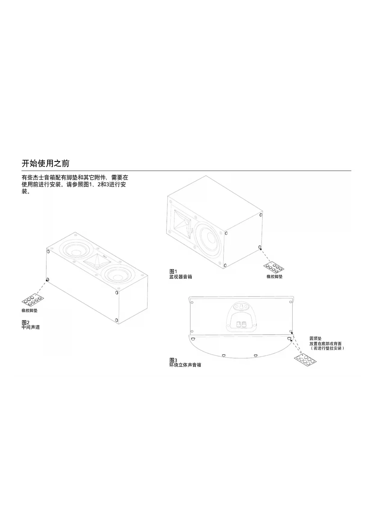 R-26F R-26FA R-24FR-28F R-14M开始使用之前 有些杰士音箱配有脚垫和其它附件,需要在 使用前进行安装。请参照图1、2和3进行安