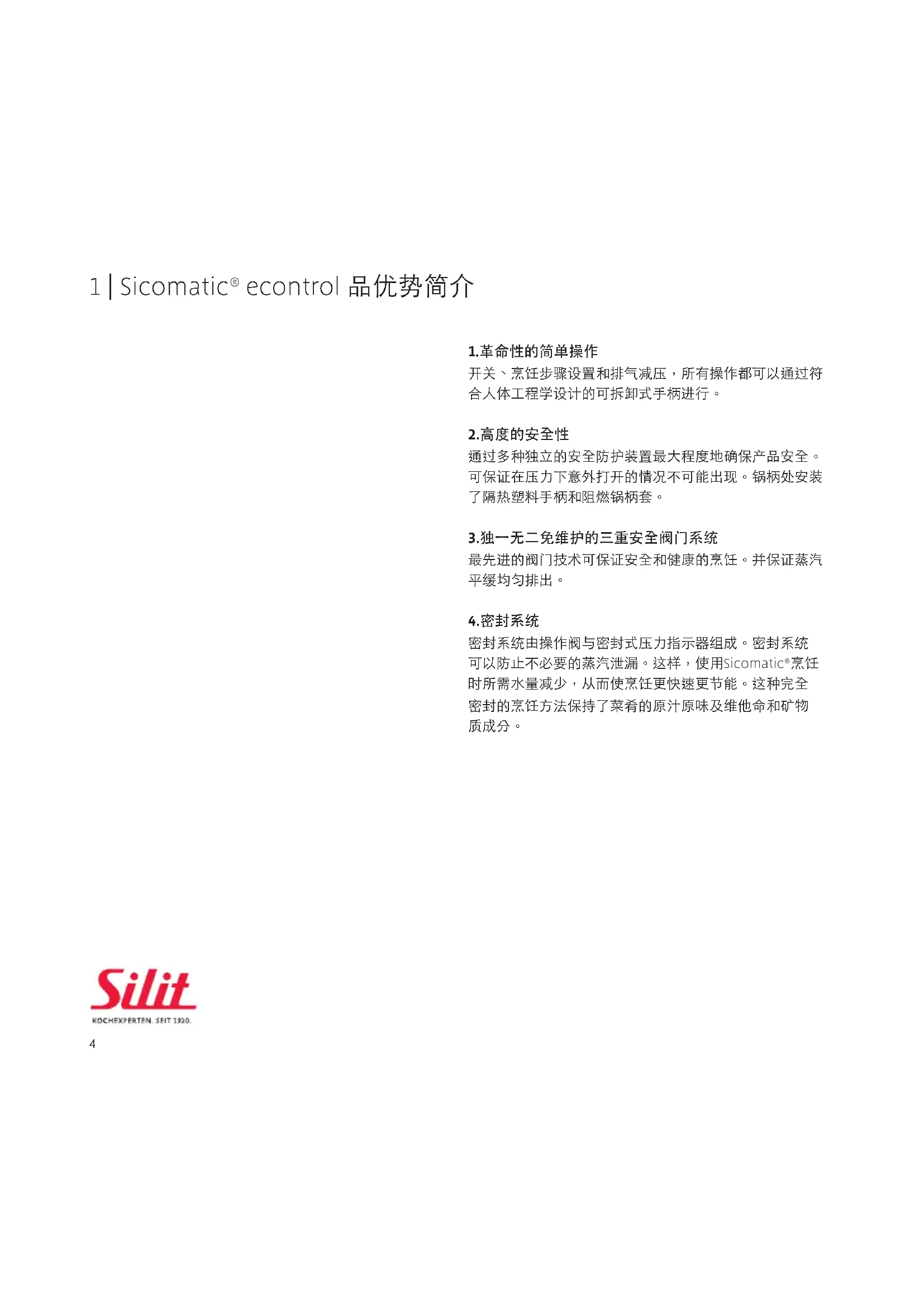 ZH4 1 | Sicomatic® econtrol产品优势简介 1.革命性的简单操作 开关、烹饪步骤设置和排气减压,所有操作都可以通过符 合人体工程学设计的可拆卸式手柄进行。 2.高度的安全性 通过多种独立的安全防护装置最大程度地确保产品安全。 可保证在压力下意外打开的情况不可能出现。锅柄处安装 了隔热塑料手柄和阻燃锅柄套。 3.独一无二免维护的三重安全阀门系统 最先进的阀门技术可保证安全和健康的烹饪。并保证蒸汽