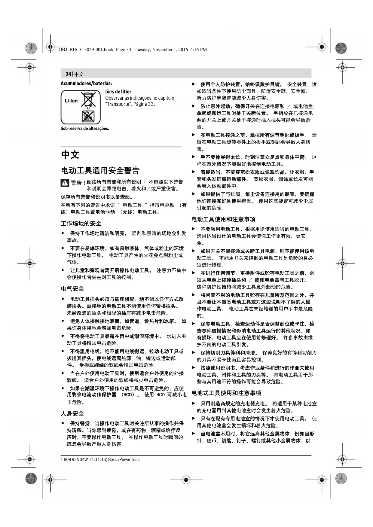 OBJ_BUCH-3029-001.book Page 38 Tuesday, November 1, 2016 4:16 PM中文 | 39 Bosch Power Tools 1 609 92A 34W | (1.11.16)但是如果将它交由第三者运送 (例如:寄空运或委托运输公司)则要使用特殊的包装和标示。此时必须向危险物品专家请教有关寄送危险物品的相关事宜。确定蓄电池的外壳未受损后,才可以寄送蓄电池。 粘好未加盖的触点并包装好蓄电池,不可以让蓄电池在包装 必要时也得注意各国有关的法规。 必须以符合环保的方式,回收再利用损坏的电动工具,蓄电池,附件和废弃的包装材料。不可以把电动工具和蓄电池 / 电池丢入一般的家庭垃圾
