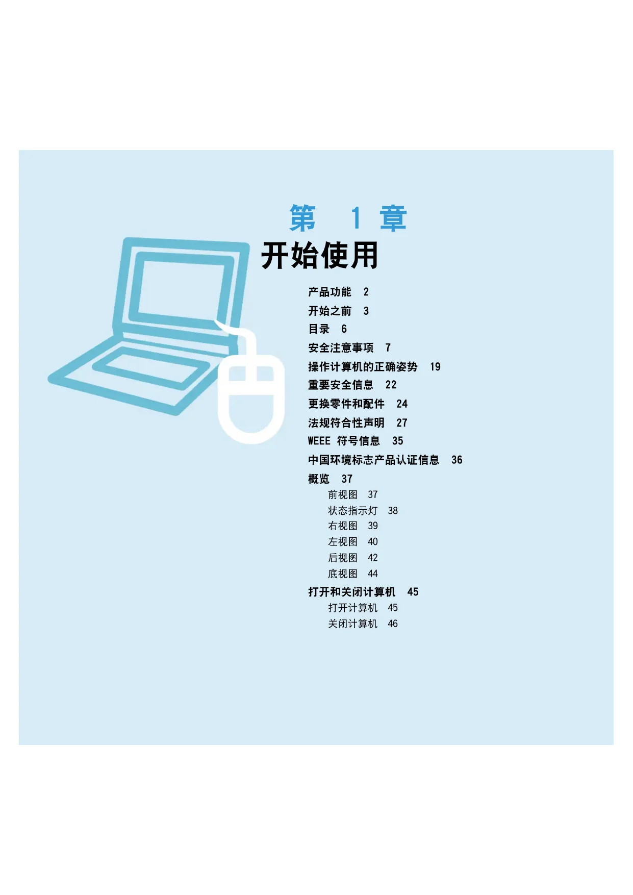 产品功能 2 开始之前 3 目录 6 安全注意事项 7 操作计算机的正确姿势 19 重要安全信息 22 更换零件和配件 24 法规符合性声明 27 WEEE 符号信息 35 中国环境标志产品认证信息 36 概览 37 前视图 37 状态指示灯 38 右视图 39 左视图 40 后视图 42 底视图 44 打开和关闭计算机 45 打开计算机 45 关闭计算机 46 第 1 章2