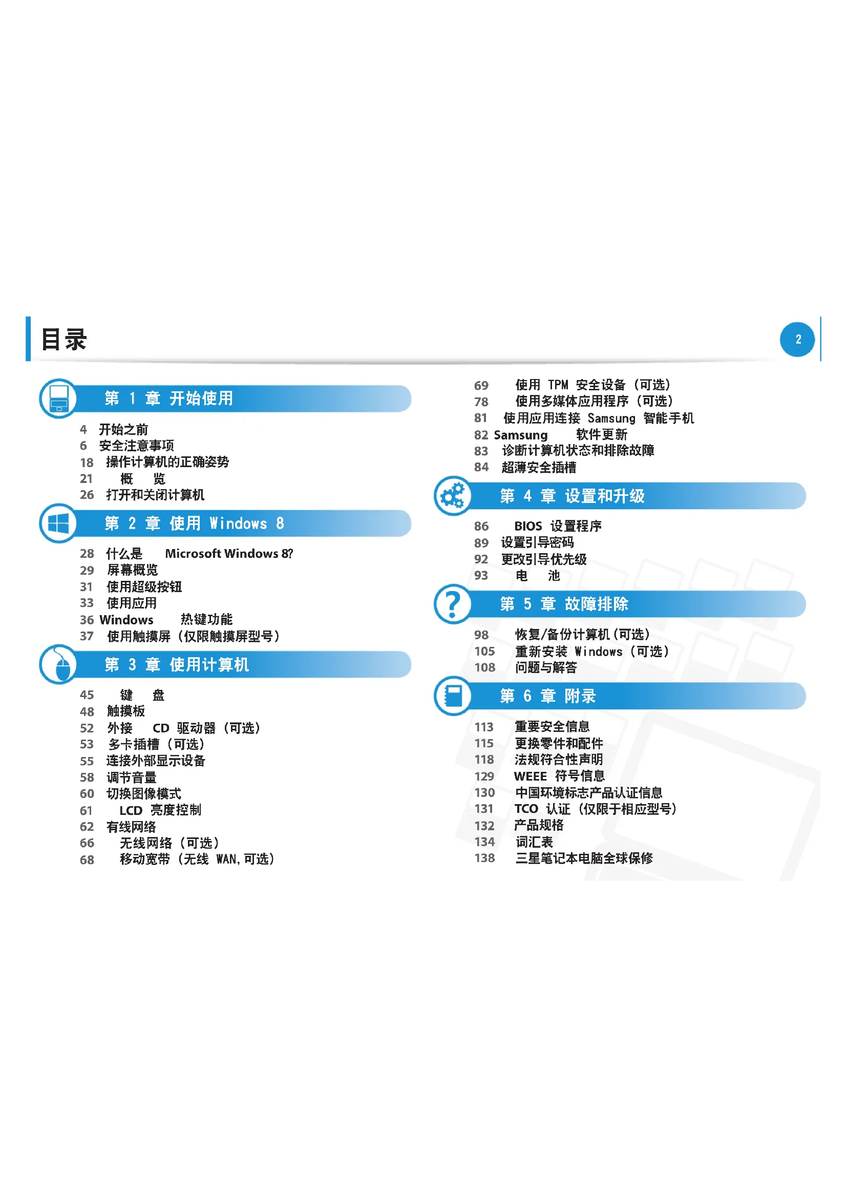 三星笔记本电脑全球保修2 第 1 章. 开始使用 开始之前 4 安全注意事项 6 操作计算机的正确姿势 18 概览 21 打开和关闭计算机 264 第 1 章. 开始使用