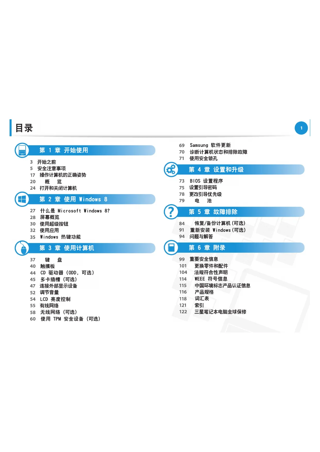 重要安全信息 99 更换零件和配件 101 法规符合性声明 104 WEEE 符号信息 114 中国环境标志产品认证信息 115 产品规格 116 词汇表 118 索引 121 三星笔记本电脑全球保修 12299 第 6 章. 附录