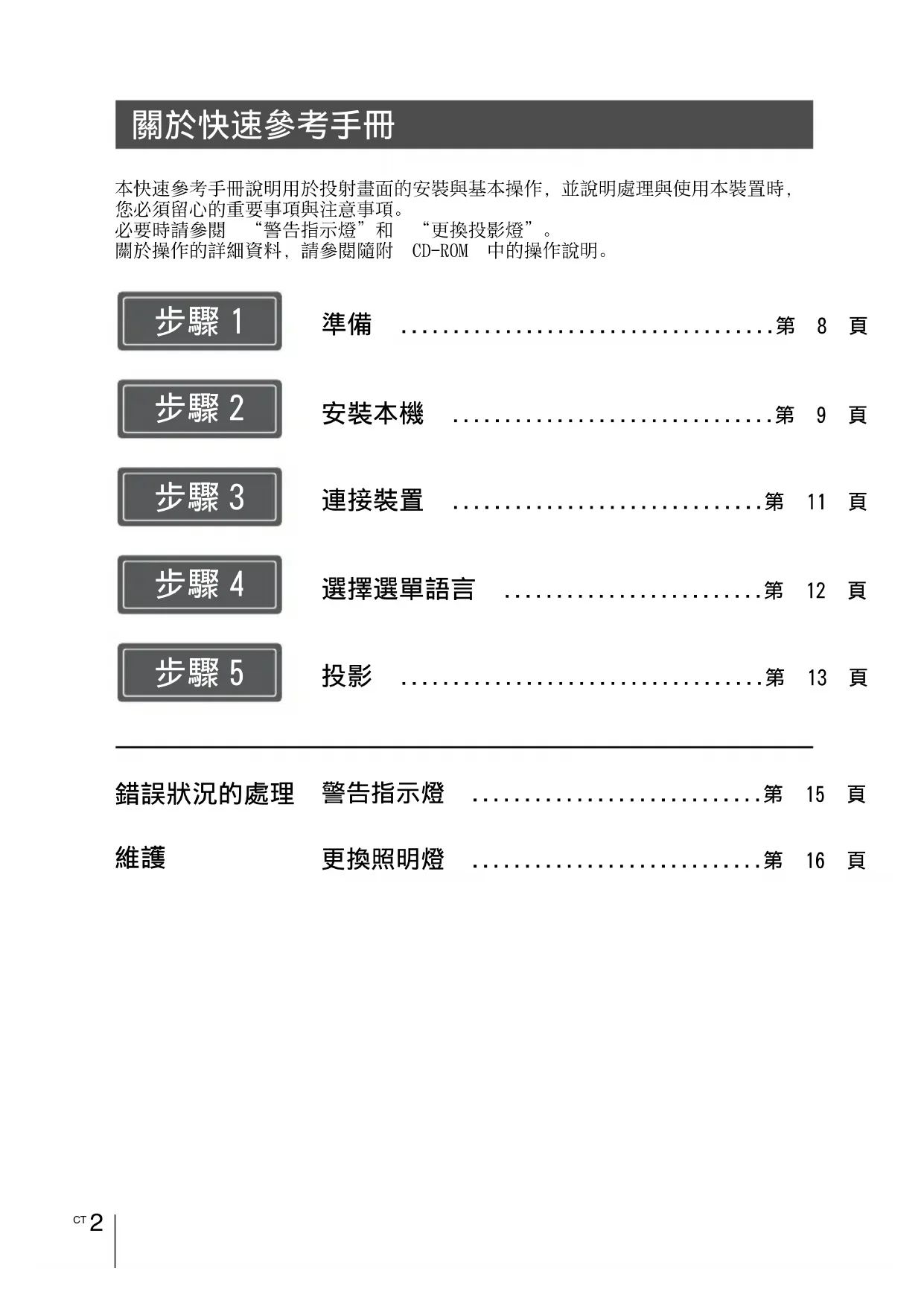 本快速參考手冊說明用於投射畫面的安裝與基本操作,並說明處理與使用本裝置時, 您必須留心的重要事項與注意事項。 必要時請參閱 “警告指示燈”和 “更換投影燈”。 關於操作的詳細資料,請參閱隨附 CD-ROM 中的操作說明。