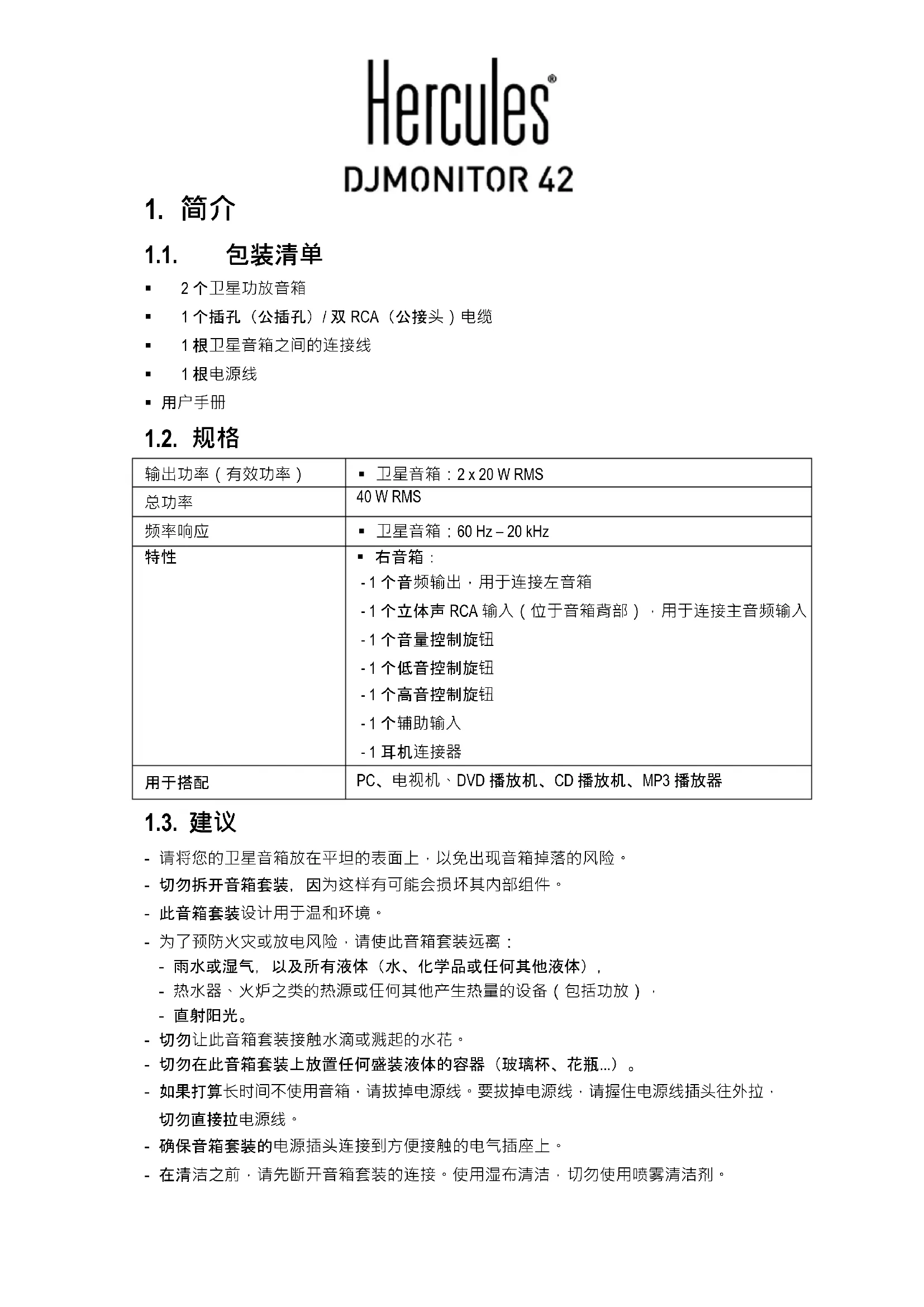https://support.hercules.com1. 简介 1.1. 包装清单 2 个卫星功放音箱 1 个插孔(公插孔)/ 双 RCA(公接头)电缆 1 根卫星音箱之间的连接线 1 根电源线
