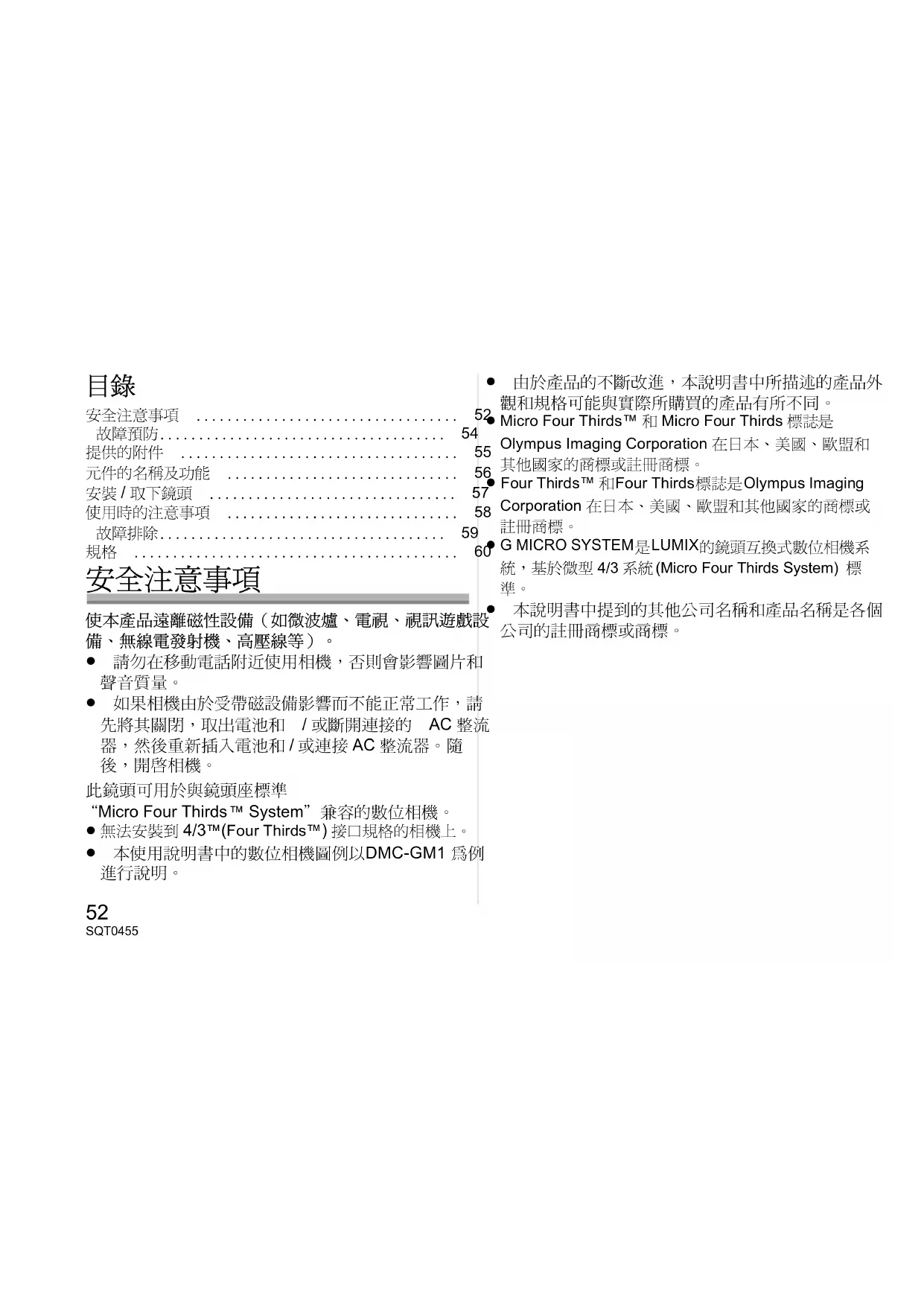 Micro Four Thirds™ 和 Micro Four Thirds 標誌是 Olympus Imaging Corporation 在日本、美國、歐盟和 其他國家的商標或註冊商標。 ≥ Four Thirds™ 和Four Thirds標誌是Olympus Imaging Corporation 在日本、美國、歐盟和其他國家的商標或
