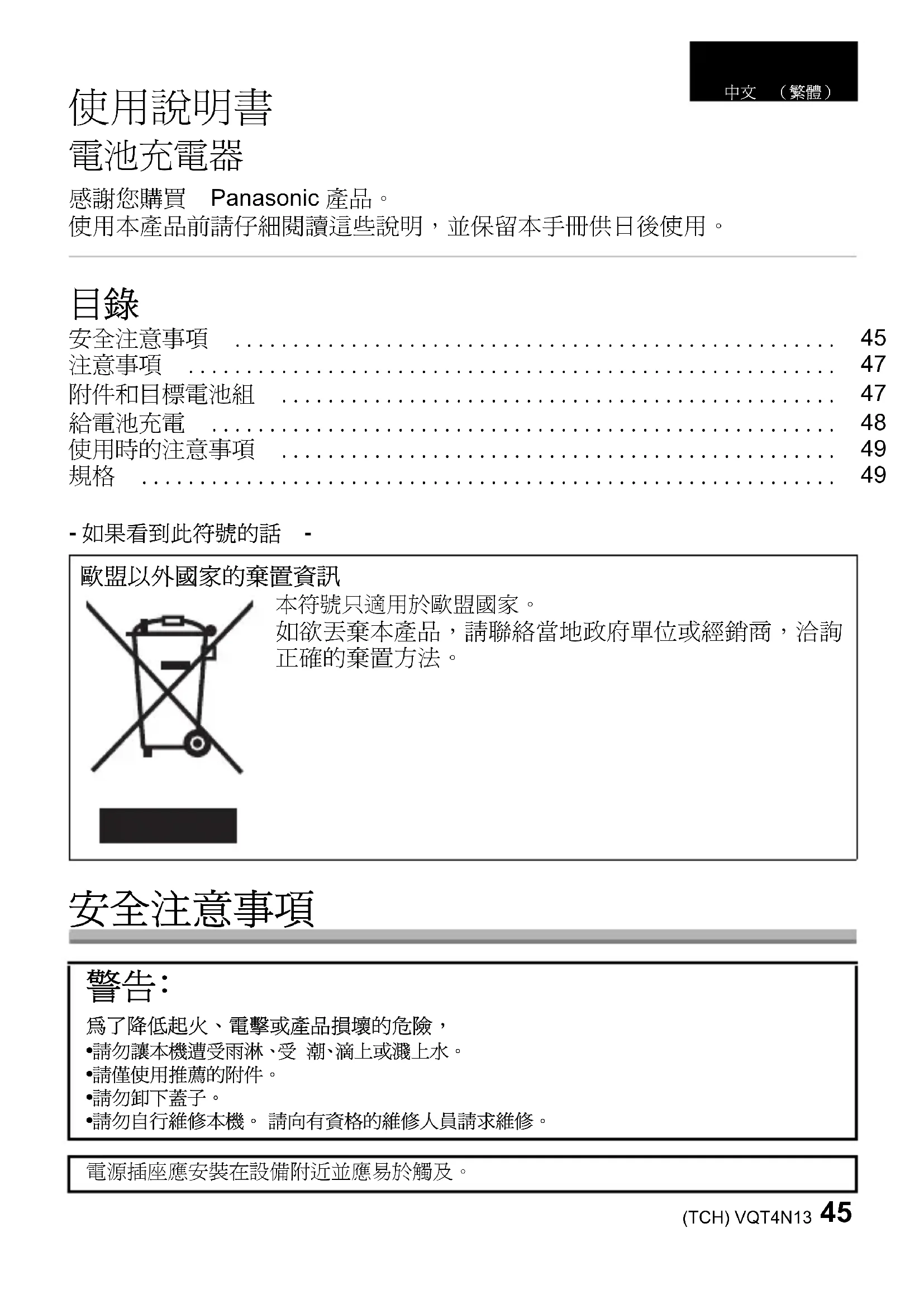 為了降低起火、電擊或產品損壞的危險,• 請勿讓本機遭受雨淋、受 潮、滴上或濺上水。• 請僅使用推薦的附件。• 請勿卸下蓋子。• 請勿自行維修本機。 請向有資格的維修人員請求維修。電源插座應安裝在設備附近並應易於觸及。中文 (繁體) VQT4N13.book 45 ページ 2012年11月30日 金曜日 午後3時26分VQT4N13 (TCH)