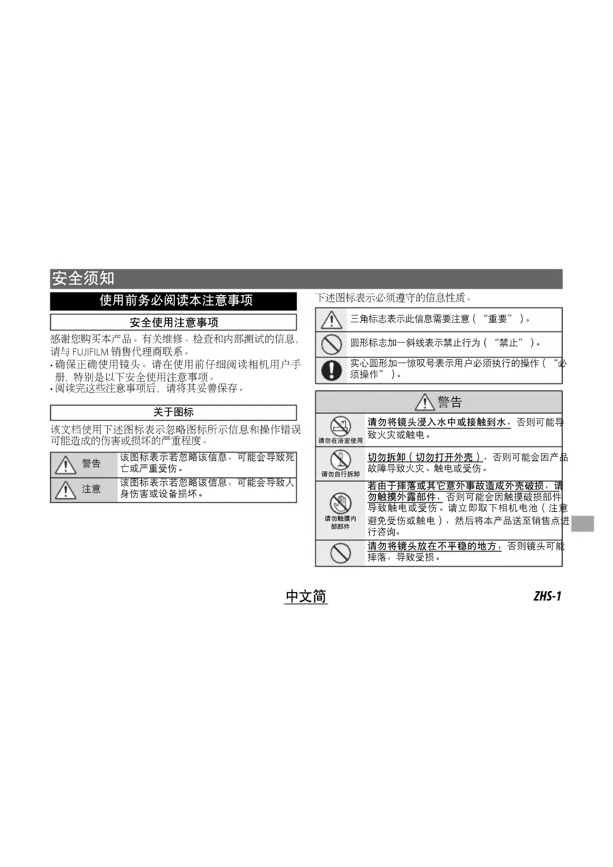 请勿在浴室使用请勿将镜头浸入水中或接触到水,否则可能导致火灾或触电。请勿自行拆卸切勿拆卸(切勿打开外壳),否则可能会因产品故障导致火灾、触电或受伤。请勿触摸内 若由于摔落或其它意外事故造成外壳破损,请勿触摸外露部件,否则可能会因触摸破损部件导致触电或受伤。请立即取下相机电池(注意避免受伤或触电),然后将本产品送至销售点进 请勿将镜头放在不平稳的地方,否则镜头可能摔落,导致受损。ZHS-2