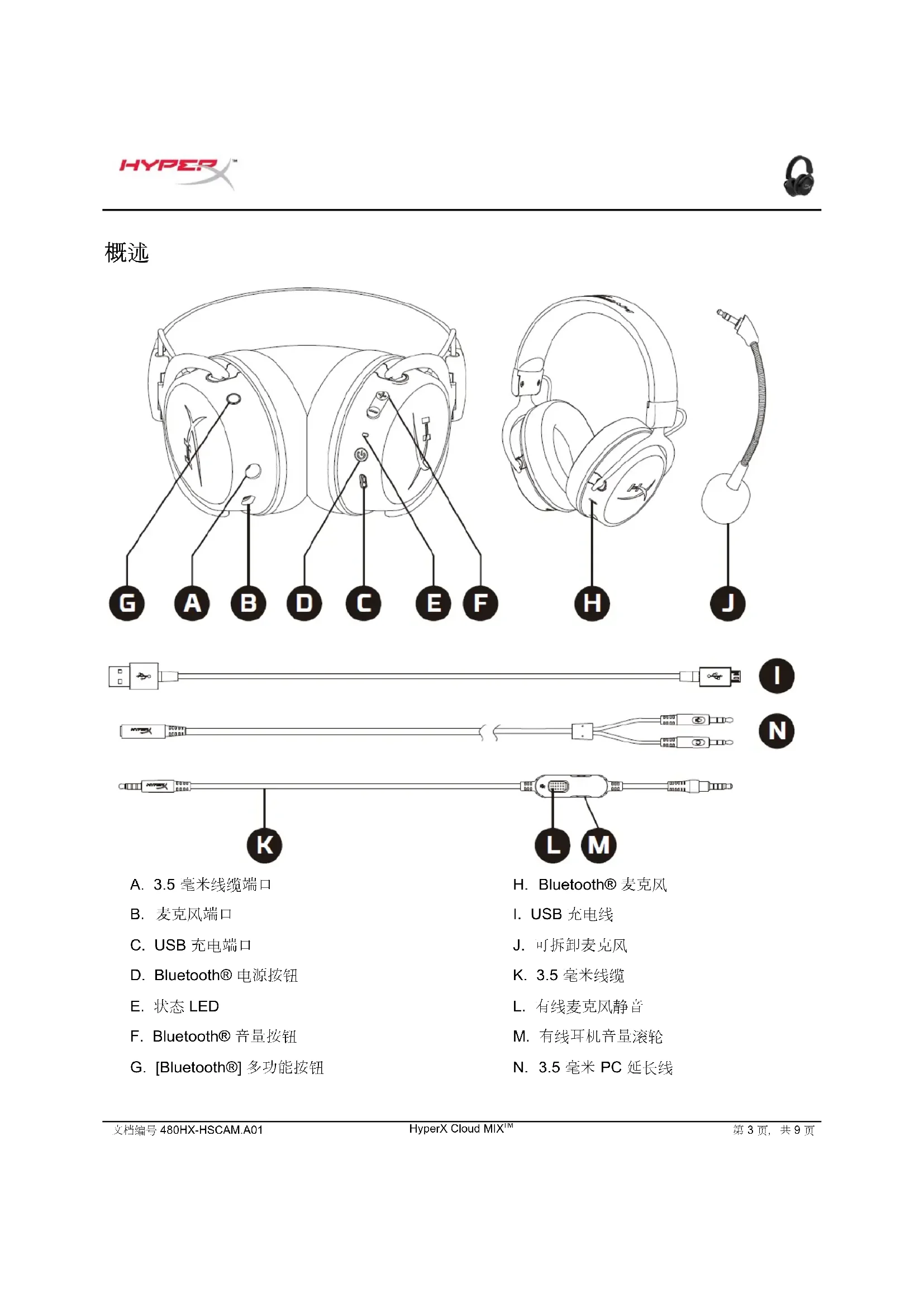 J. 可拆式麥克風 K. 3.5mm 音源線 L. 有線麥克風靜音 M. 有線耳機音量滾輪 N. 3.5Mm 電腦延長線文件號碼:480HX-HSCAM.A01 HyperX Cloud MIX