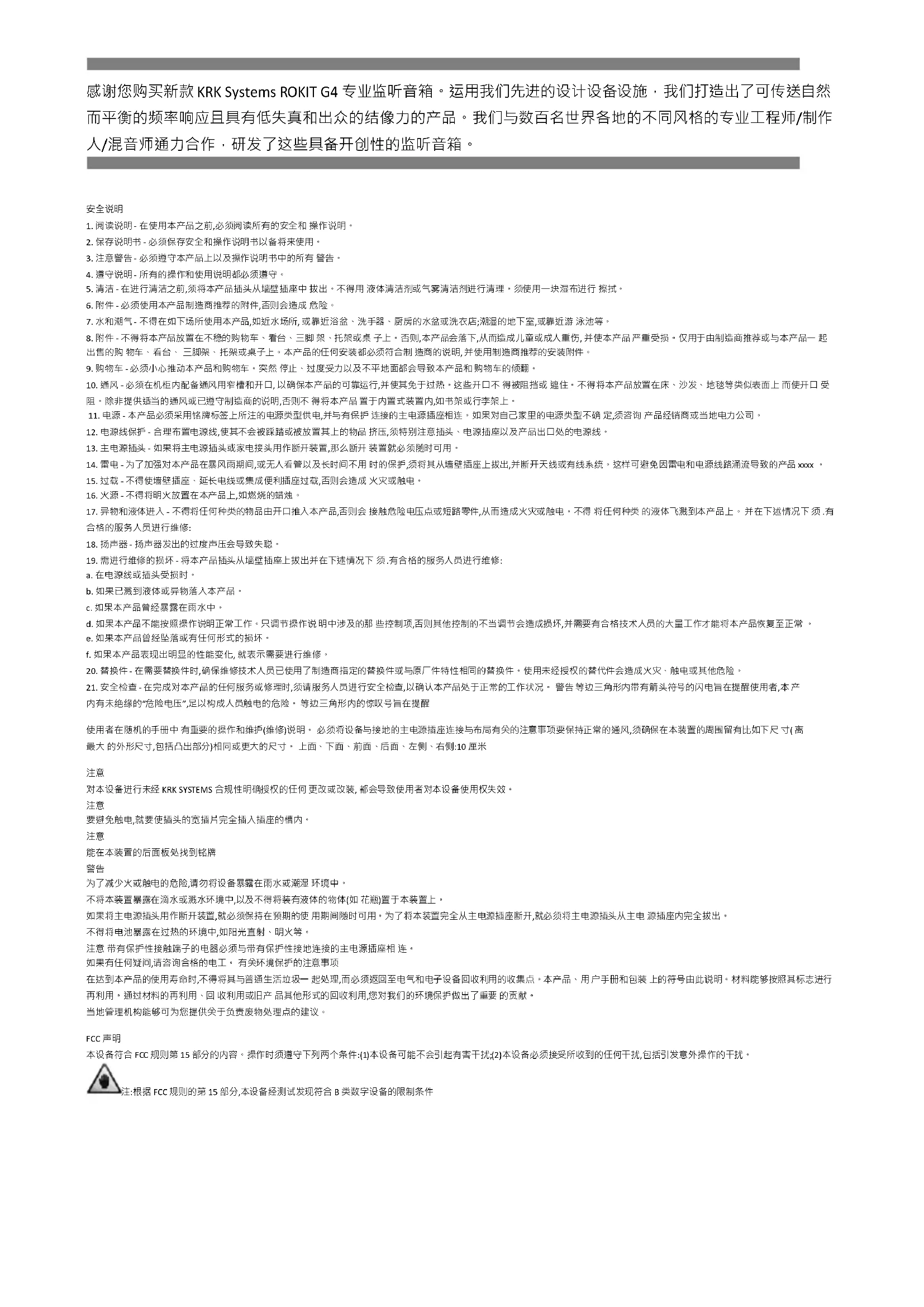 对本设备进行未经 KRK SYSTEMS 合规性明确授权的任何 更改或改装, 都会导致使用者对本设备使用权失效。