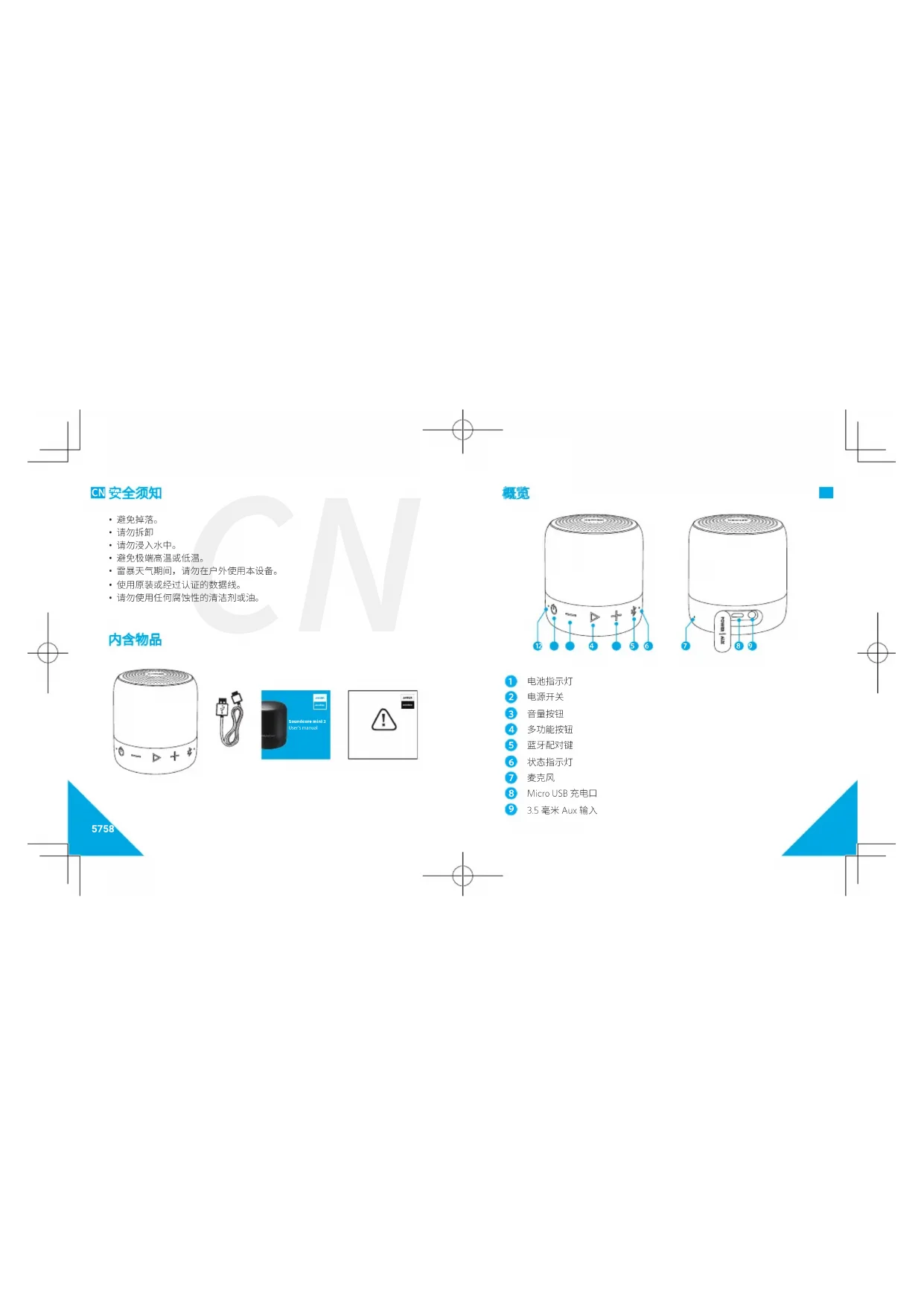 - 避免掉落。• 请勿拆卸• 请勿浸入水中。• 避免极端高温或低温。• 雷暴天气期间,请勿在户外使用本设备。• 使用原装或经过认证的数据线。• 请勿使用任何腐蚀性的清洁剂或油。 Soundcore mini 2User's manual59 60 CN CN 使用 Soundcore mini 2