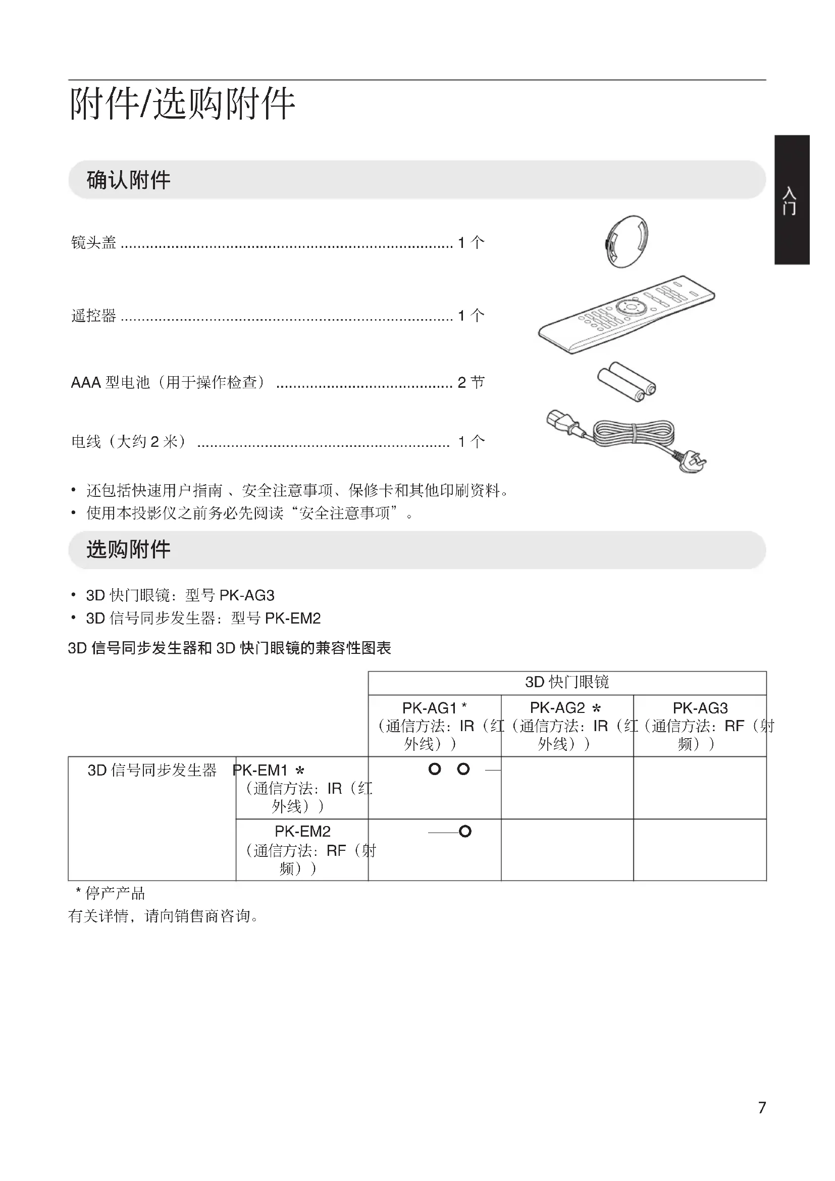 3D 信号同步发生器:型号 PK-EM2 3D 信号同步发生器和 3D 快门眼镜的兼容性图表 3D 快门眼镜 PK-AG1 * (通信方法:IR(红