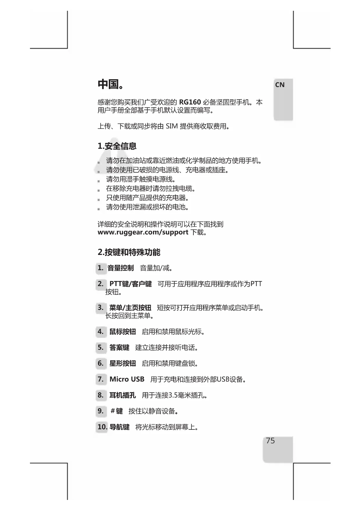 Az európai vásárlók számára kérjük, ellenőrizze: https://ruggear.com/warranty-terms/ Az amerikaiak ügyfelei számára kérjük, ellenőrizze: https://ruggear.com/terms-and-conditions-americas/ Az FCC információiért látogasson el a www.RugGear. com oldalra, és keresse meg a “Támogatás” szakaszban. 74中国。 感谢您购买我们广受欢迎的 RG160 必备坚固型手机。本 用户手册全部基于手机默认设置而编写。 上传、下载或同步将由 SIM 提供商收取费用。 1.安全信息 请勿在加油站或靠近燃油或化学制品的地方使用手机。 请勿使用已破损的电源线、充电器或插座。 请勿用湿手触摸电源线。 在移除充电器时请勿拉拽电缆。 只使用随产品提供的充电器。 请勿使用泄漏或损坏的电池。 详细的安全说明和操作说明可以在下面找到 www.ruggear.com/support 下载。 2.按键和特殊功能