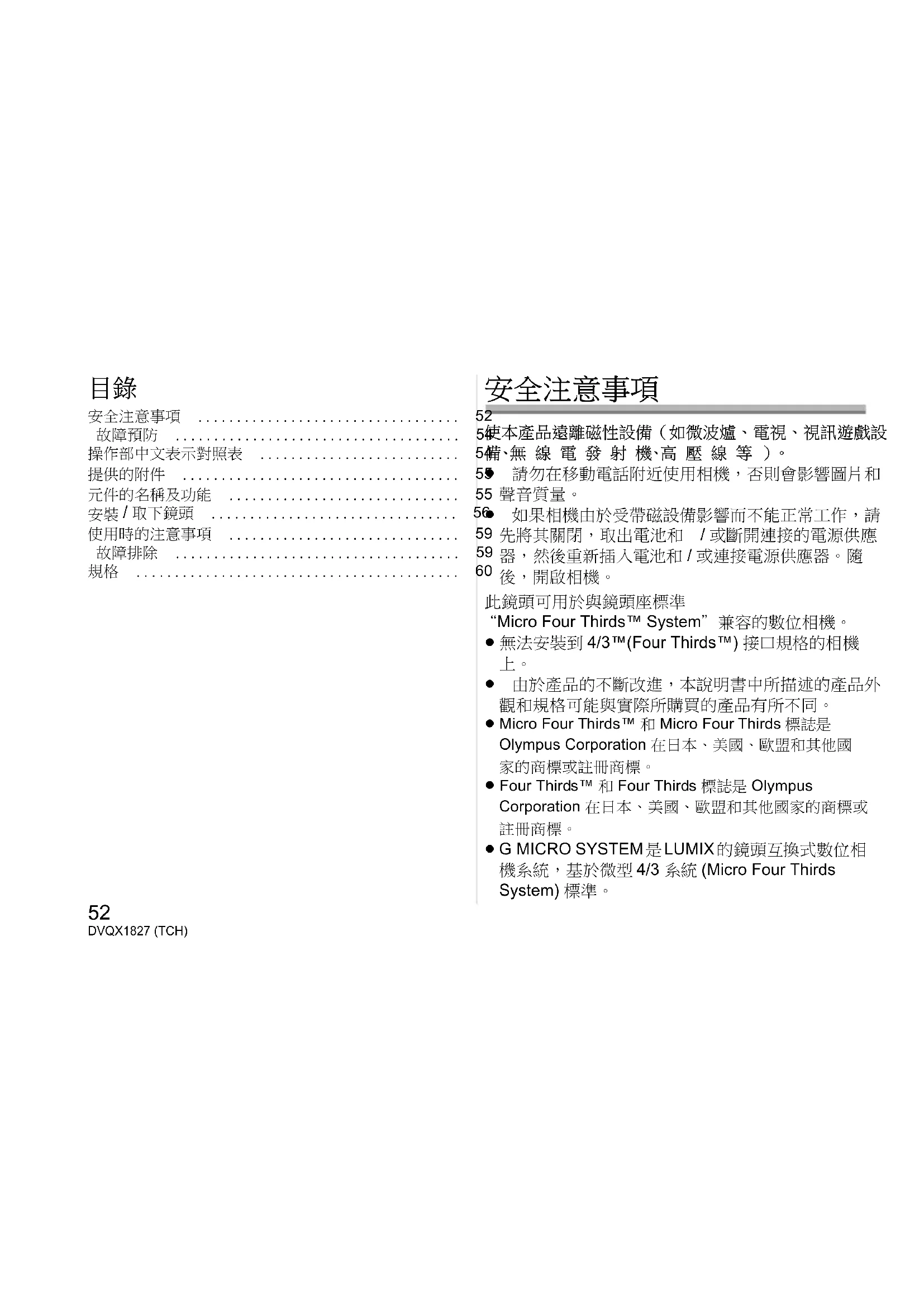 機系統,基於微型 4/3 系統 (Micro Four Thirds System) 標準。 H-FSA14140_OI_DVQX1827ZA.book 52 ページ 2019年3月18日 月曜日 午後12時9分53 (TCH) DVQX1827 ≥ 本說明書中提到的其他公司名稱和產品名稱是各個 公司的註冊商標或商標。