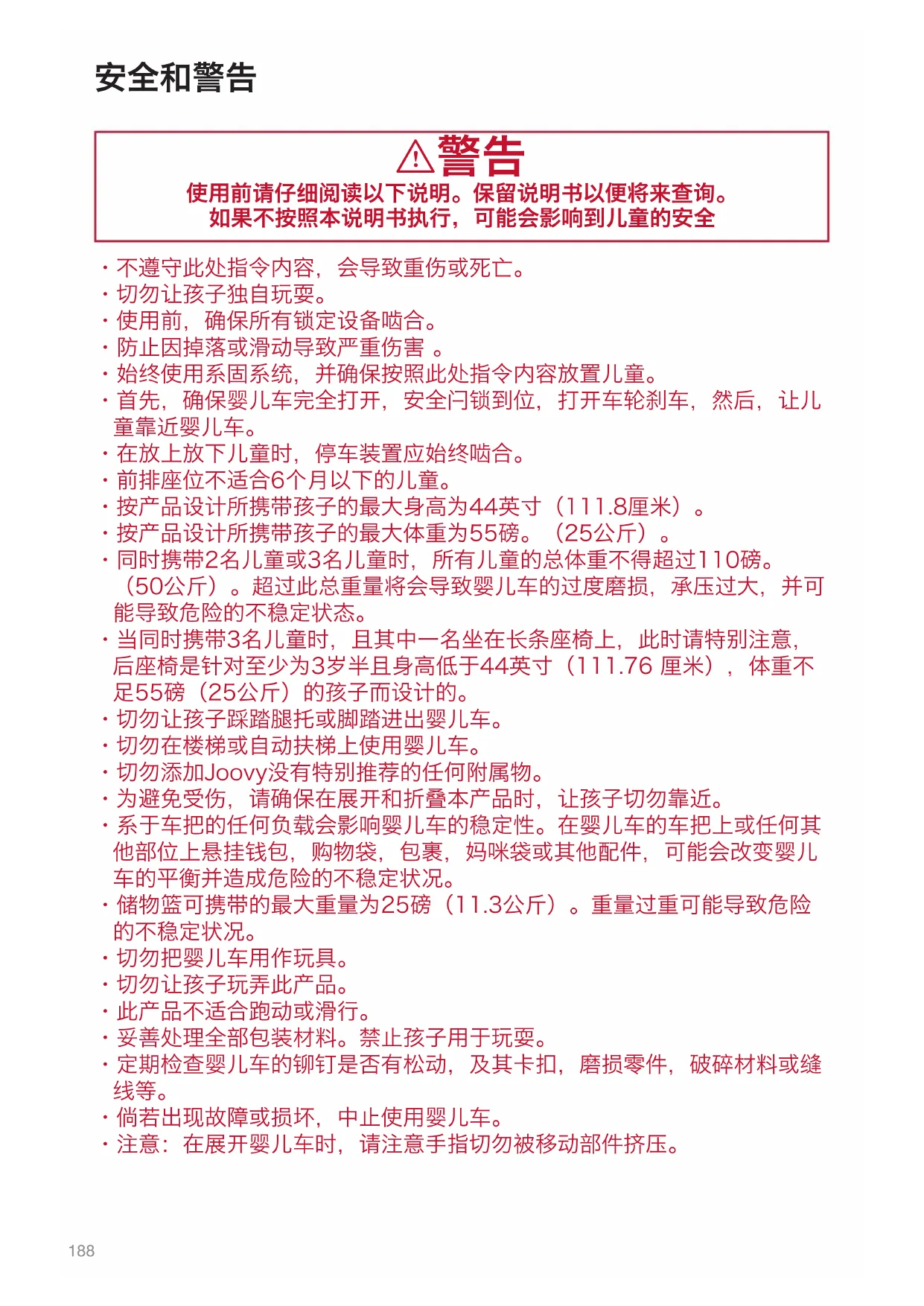- 座椅可以置于婴儿车的前面或后面。 I警告:仅在JoovyQool婴儿车上使用。此座位不适合6个月以下的 儿童。按产品设计所携带孩子的最大身高为44英寸(111.8厘米)。按产品 设计所携带孩子的最大体重为55磅。(25公斤)。同时携带2名儿童或3名 儿童时,所有儿童的总体重不得超过110磅。(50公斤)。超过此总重量将 会导致婴儿车的过度磨损,承压过大,并可能导致危险的不稳定状态。切勿 让孩子独自玩耍。防止因掉落或滑动导致严重伤害。始终使用束缚系统。本 产品不是玩具。禁止孩子用于玩耍。209