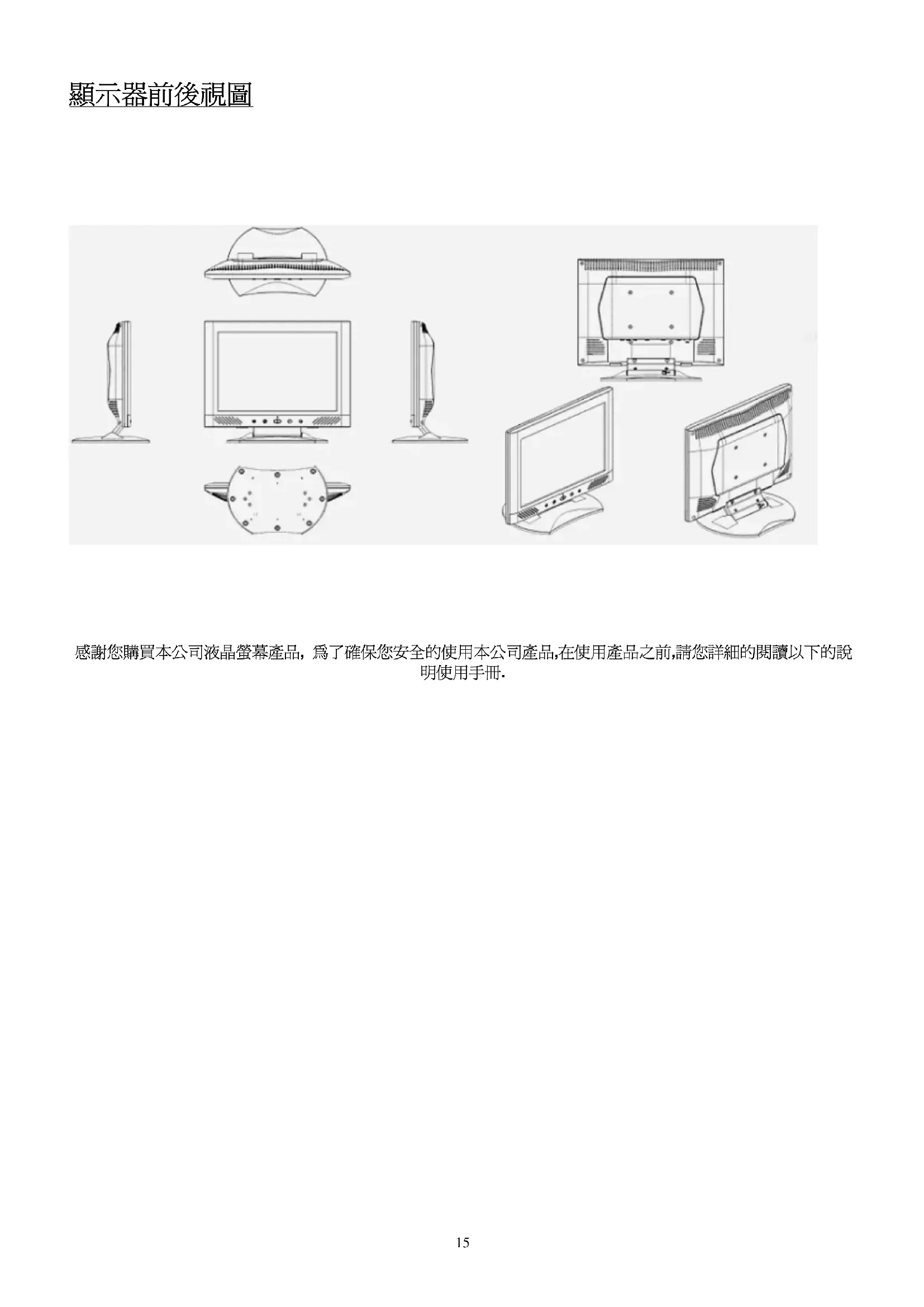 感謝您購買本公司液晶螢幕產品, 為了確保您安全的使用本公司產品,在使用產品之前,請您詳細的閱讀以下的說 明使用手冊.16