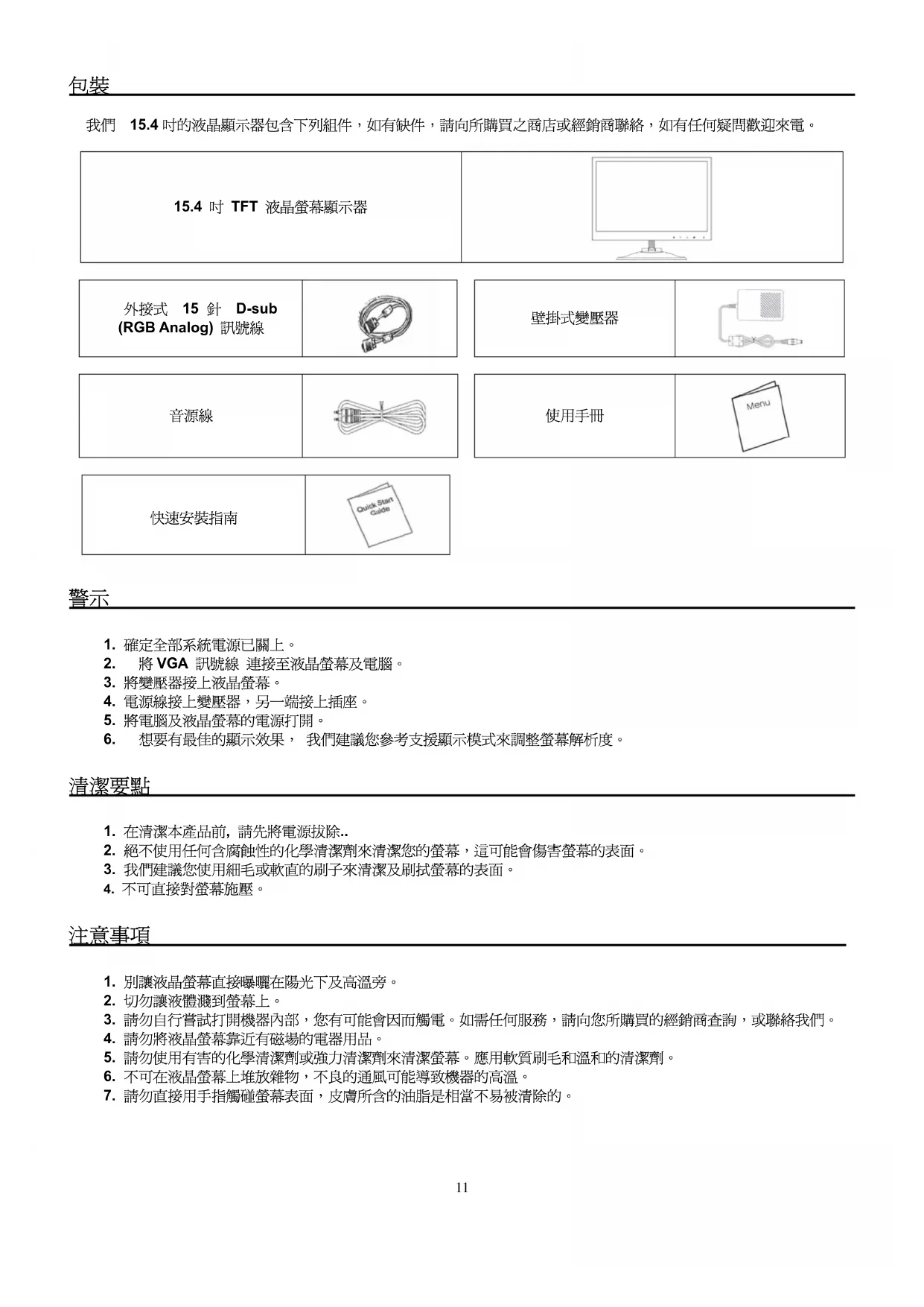 我们 15.4 吋的液晶显示器包含下列组件,如有缺件,请向所购买之商店或经销商联络,如有任何疑问欢迎来电。