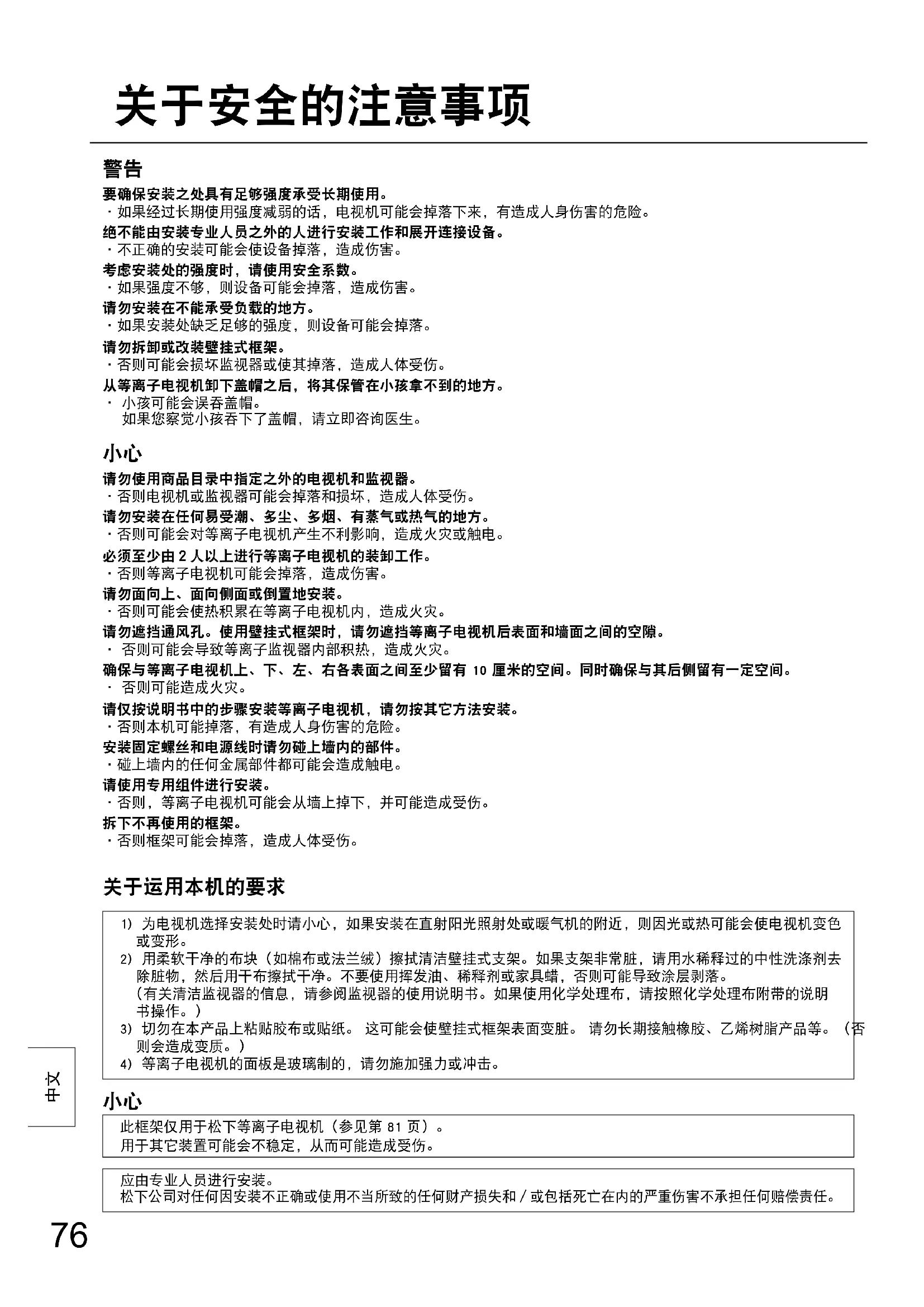 2) 用柔软干净的布块(如棉布或法兰绒)擦拭清洁壁挂式支架。如果支架非常脏,请用水稀释过的中性洗涤剂去除脏物,然后用干布擦拭干净。不要使用挥发油、稀释剂或家具蜡,否则可能导致涂层剥落。(有关清洁监视器的信息,请参阅监视器的使用说明书。如果使用化学处理布,请按照化学处理布附带的说明书操作。)3) 切勿在本产品上粘贴胶布或贴纸。 这可能会使壁挂式框架表面变脏。 请勿长期接触橡胶、乙烯树脂产品等。(否则会造成变质。)4) 等离子电视机的面板是玻璃制的,请勿施加强力或冲击。 此框架仅用于松下等离子电视机(参见第 81 页)。用于其它装置可能会不稳定,从而可能造成受伤。应由专业人员进行安装。松下公司对任何因安装不正确或使用不当所致的任何财产损失和/或包括死亡在内的严重伤害不承担任何赔偿责任。 关于安全的注意事项77
