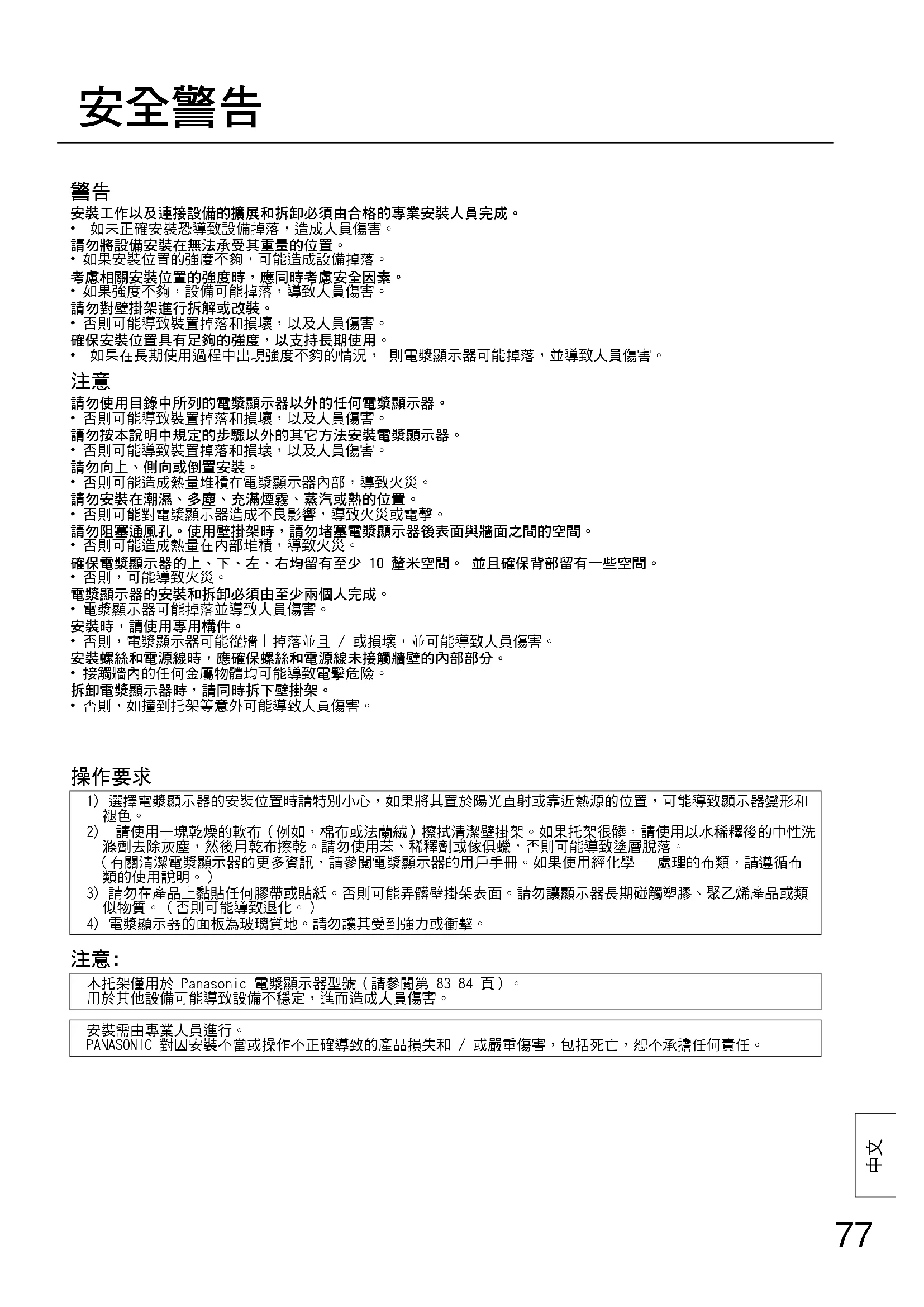 2) 請使用一塊乾燥的軟布(例如,棉布或法蘭絨)擦拭清潔壁掛架。如果托架很髒,請使用以水稀釋後的中性洗滌劑去除灰塵,然後用乾布擦乾。請勿使用苯、稀釋劑或傢俱蠟,否則可能導致塗層脫落。(有關清潔電漿顯示器的更多資訊,請參閱電漿顯示器的用戶手冊。如果使用經化學 - 處理的布類,請遵循布類的使用說明。)3) 請勿在產品上黏貼任何膠帶或貼紙。否則可能弄髒壁掛架表面。請勿讓顯示器長期碰觸塑膠、聚乙烯產品或類似物質。(否則可能導致退化。)4) 電漿顯示器的面板為玻璃質地。請勿讓其受到強力或衝擊。 本托架僅用於 Panasonic 電漿顯示器型號(請參閱第 83-84 頁)。用於其他設備可能導致設備不穩定,進而造成人員傷害。安裝需由專業人員進行。PANASONIC 對因安裝不當或操作不正確導致的產品損失和 / 或嚴重傷害,包括死亡,恕不承擔任何責任。 中文78