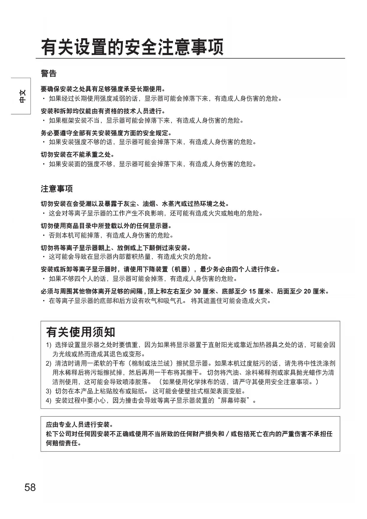 - 在等离子显示器的底部和后方设有吹气和吸气孔。 将其遮盖住可能会造成火灾。 1) 选择设置显示器之处时要慎重,因为如果将显示器置于直射阳光或靠近加热器具之处的话,可能会因为光线或热而造成其退色或变形。2) 清洁时请用一柔软的干布(棉制或法兰绒)擦拭显示器。如果本机过度脏污的话,请先将中性洗涤剂用水稀释后将污垢擦拭掉,然后再用一干布将其擦干。 切勿将汽油、涂料稀释剂或家具抛光蜡作为清洁剂使用,这可能会导致喷漆脱落。 (如果使用化学抹布的话,请严守其使用安全注意事项。)3) 切勿在本产品上粘贴胶布或贴纸。 这可能会使壁挂式框架表面变脏。4) 安装过程中要小心,因为撞击会导致等离子显示器装置的“屏幕碎裂”。 有关设置的安全注意事项 应由专业人员进行安装。 松下公司对任何因安装不正确或使用不当所致的任何财产损失和/或包括死亡在内的严重伤害不承担任何赔偿责任。 要确保安装之处具有足够强度承受长期使用。· 如果经过长期使用强度减弱的话,显示器可能会掉落下来,有造成人身伤害的危险。安装和拆卸均仅能由有资格的技术人员进行。· 如果框架安装不当,显示器可能会掉落下来,有造成人身伤害的危险。务必要遵守全部有关安装强度方面的安全规定。· 如果安装强度不够的话,显示器可能会掉落下来,有造成人身伤害的危险。切勿安装在不能承重之处。· 如果安装面的强度不够,显示器可能会掉落下来,有造成人身伤害的危险。 切勿安装在会受潮以及暴露于灰尘、油烟、水蒸汽或过热环境之处。· 这会对等离子显示器的工作产生不良影响,还可能有造成火灾或触电的危险。切勿使用商品目录中所登载以外的任何显示器。· 否则本机可能掉落,有造成人身伤害的危险。切勿将等离子显示器朝上、放倒或上下颠倒过来安装。· 这可能会导致在显示器内部蓄积热量,有造成火灾的危险。安装或拆卸等离子显示器和台架时,请使用下降装置(机器),最少务必由四个人进行作业。· 如果不够四个人的话,显示器可能会掉落,有造成人身伤害的危险。在等离子显示器的上方和侧面至少要留出 30 厘米、在底部和后方至少要留出 20 厘米的空间。· 在等离子显示器的底部和后方设有吹气和吸气孔。 将其遮盖住可能会造成火灾。 中文L