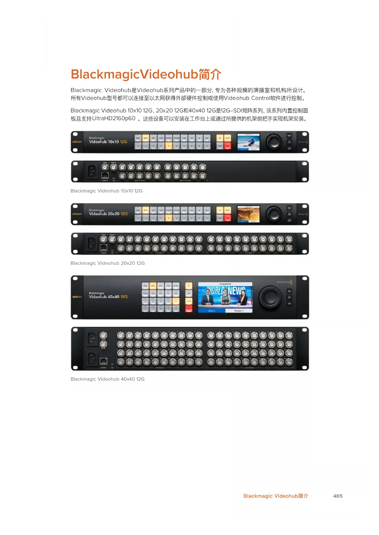 Ultra HD 2160p60 。这些设备可以安装在工作台上或通过所提供的机架侧把手实现机架安装。 Blackmagic Videohub 10x10 12G Blackmagic Videohub 20x 20 12G Blackmagic Videohub 40x40 12G