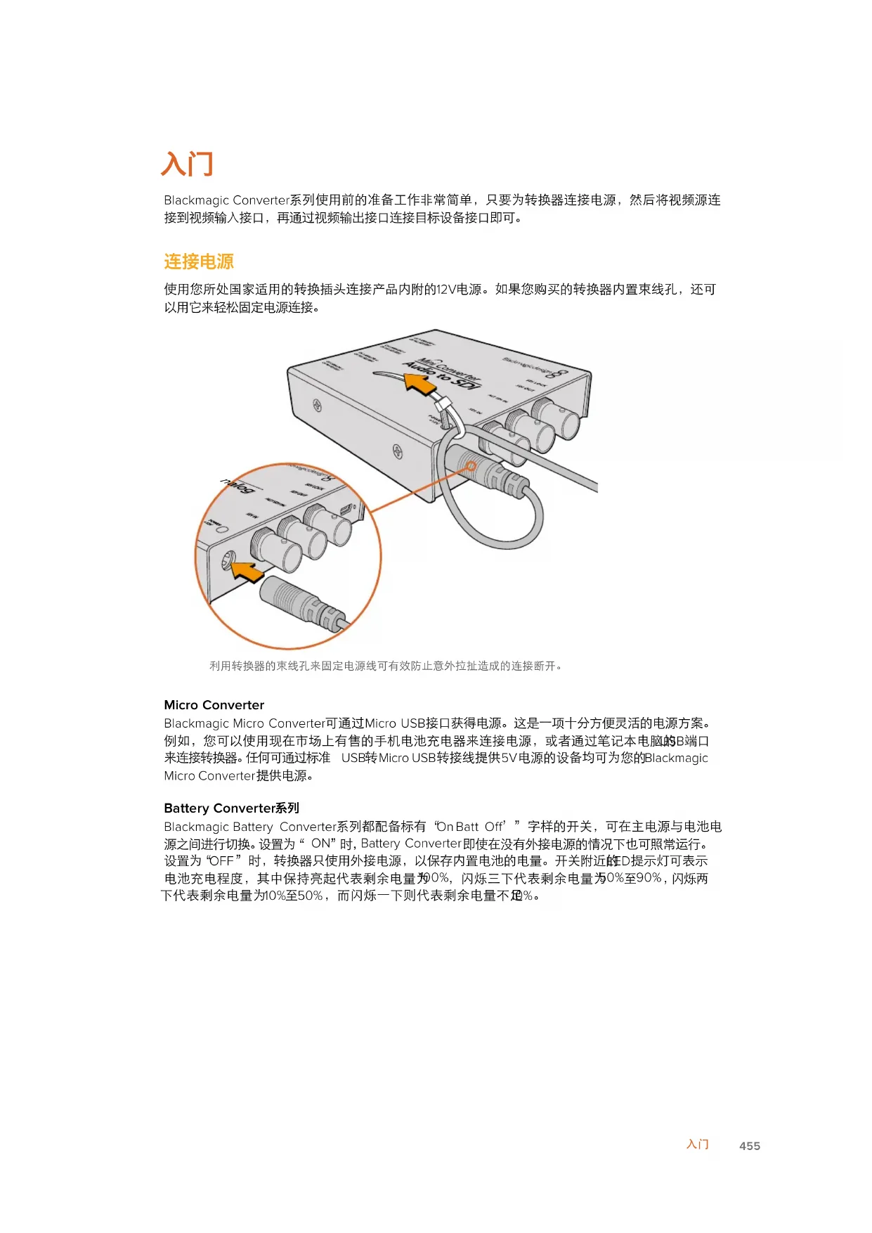 使用您所处国家适用的转换插头连接产品内附的 12V 电源。如果您购买的转换器内置束线孔,还可 以用它来轻松固定电源连接。 利用转换器的束线孔来固定电源线可有效防止意外拉扯造成的连接断开。 Micro Converter Blackmagic Micro Converter