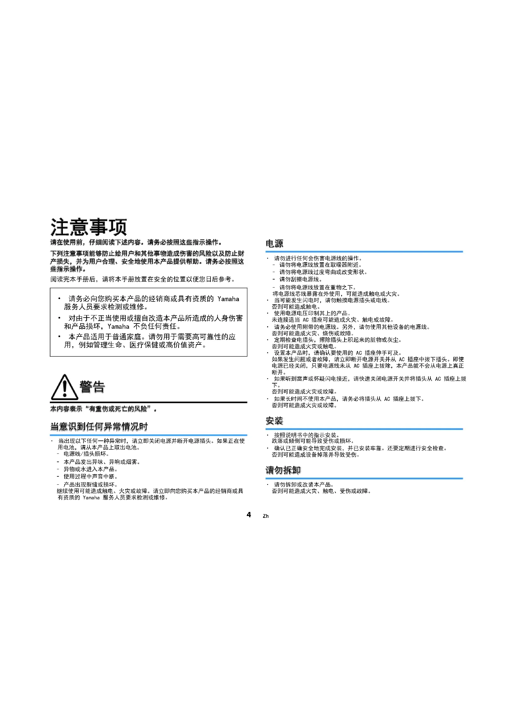 - 当出现以下任何一种异常时,请立即关闭电源并断开电源插头。如果正在使用电池,请从本产品上取出电池。– 电源线/插头损坏。– 本产品发出异味、异响或烟雾。– 异物或水进入本产品。– 使用过程中声音中断。– 产品出现裂缝或损坏。 继续使用可能造成触电、火灾或故障。请立即向您购买本产品的经销商或具有资质的 Yamaha 服务人员要求检测或维修。