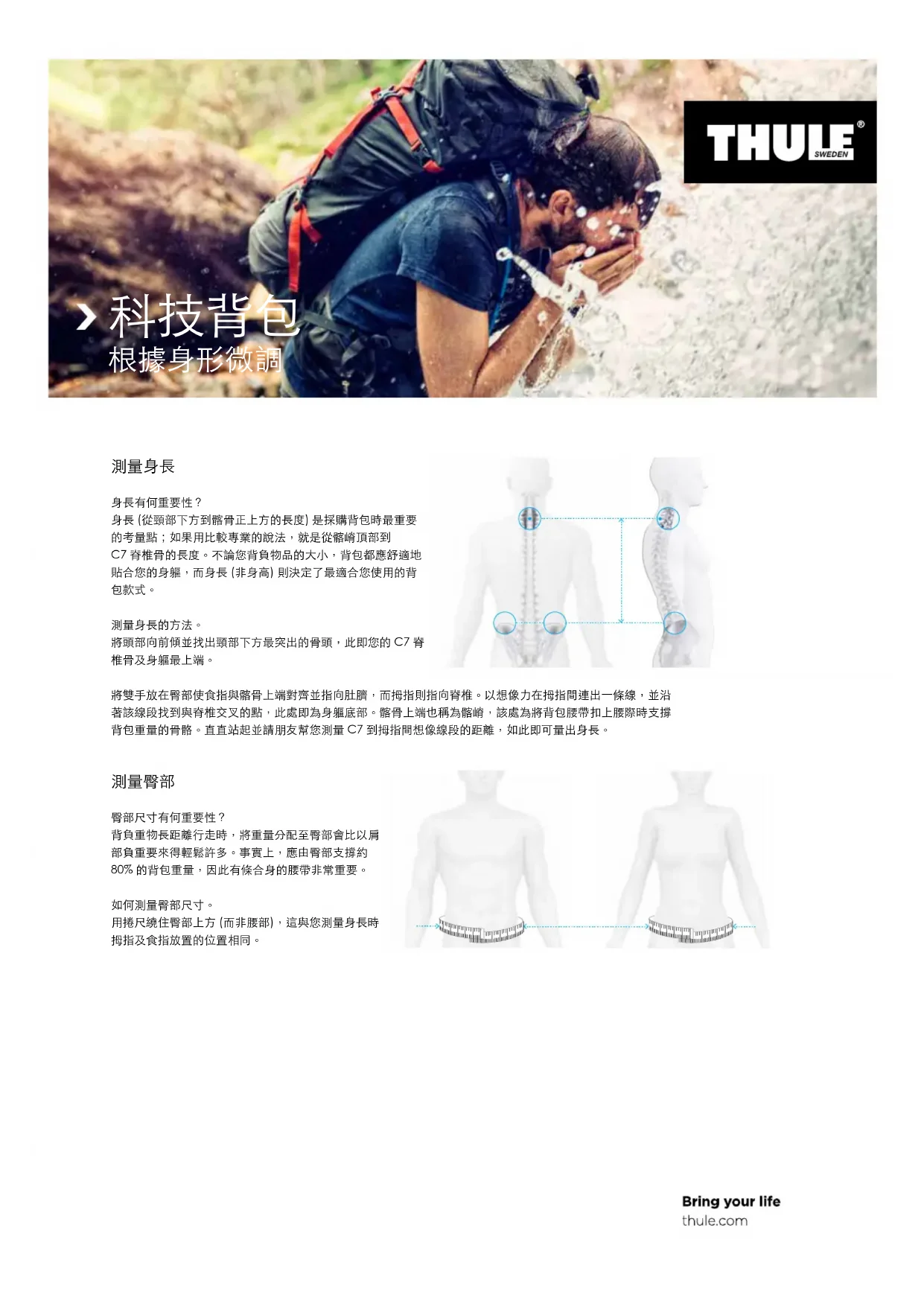 身長有何重要性?身長(從頸部下方到髂骨正上方的長度)是採購背包時最重要的考量點;如果用比較專業的說法,就是從髂嵴頂部到C7脊椎骨的長度。不論您背負物品的大小,背包都應舒適地貼合您的身軀,而身長(非身高)則決定了最適合您使用的背
