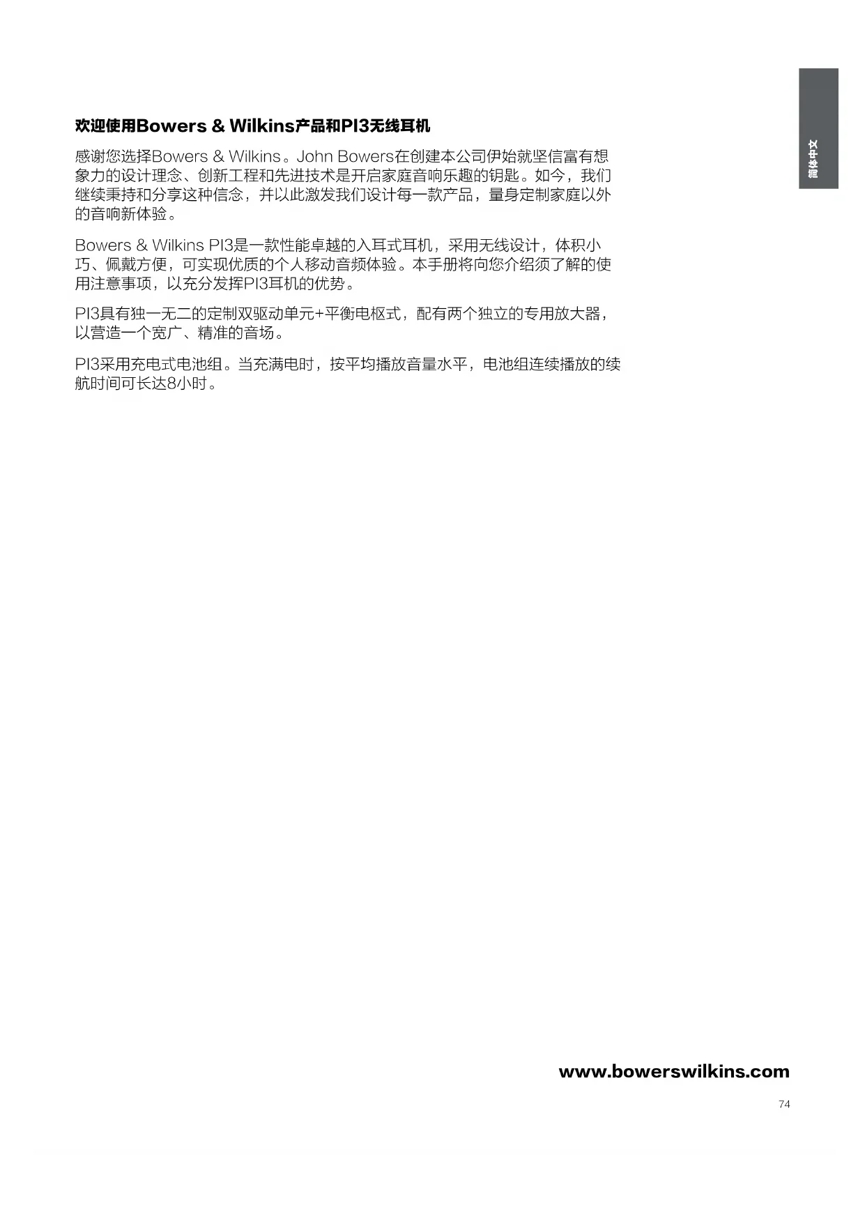 Bowers & Wilkins PI3是一款性能卓越的入耳式耳机,采用无线设计,体积小 巧、佩戴方便,可实现优质的个人移动音频体验。本手册将向您介绍须了解的使 用注意事项,以充分发挥PI3耳机的优势。 PI3具有独一无二的定制双驱动单元+平衡电枢式,配有两个独立的专用放大器, 以营造一个宽广、精准的音场。 PI3采用充电式电池组。当充满电时,按平均播放音量水平,电池组连续播放的续 航时间可长达8小时。
