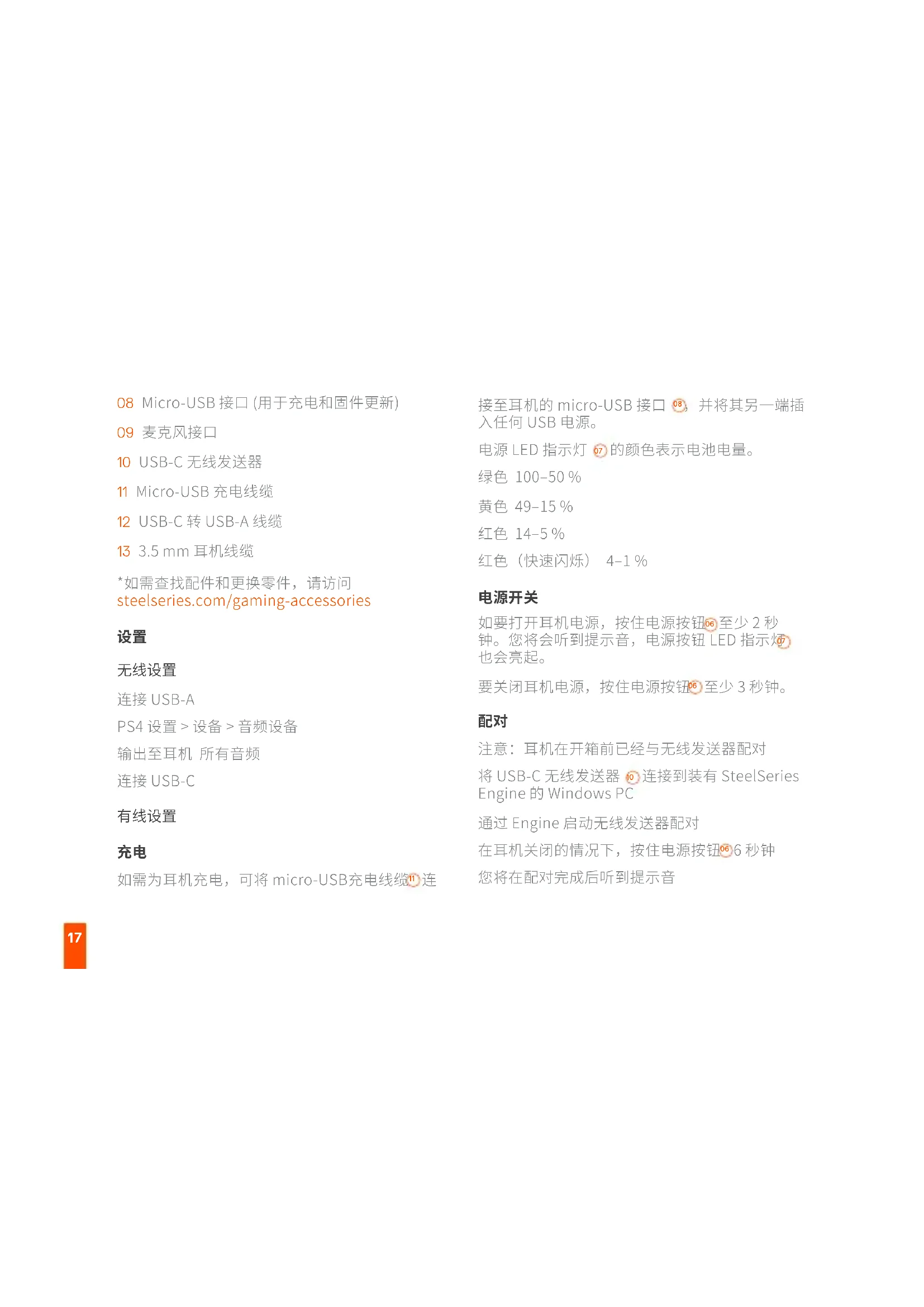 01 AirWeave 耳垫* 02 ClearCast 麦克风 03 音量轮 04 麦克风静音开关 05 3.5 mm 耳机接口 06 电源按钮 07 电源 LED 指示灯17 08 Micro-USB 接口 (用于充电和固件更新) 09 麦克风接口 10 USB-C 无线发送器 11 Micro-USB 充电线缆 12 USB-C 转 USB-A 线缆 13 3.5 mm 耳机线缆 *如需查找配件和更换零件,请访问 steelseries.com/gaming-accessories