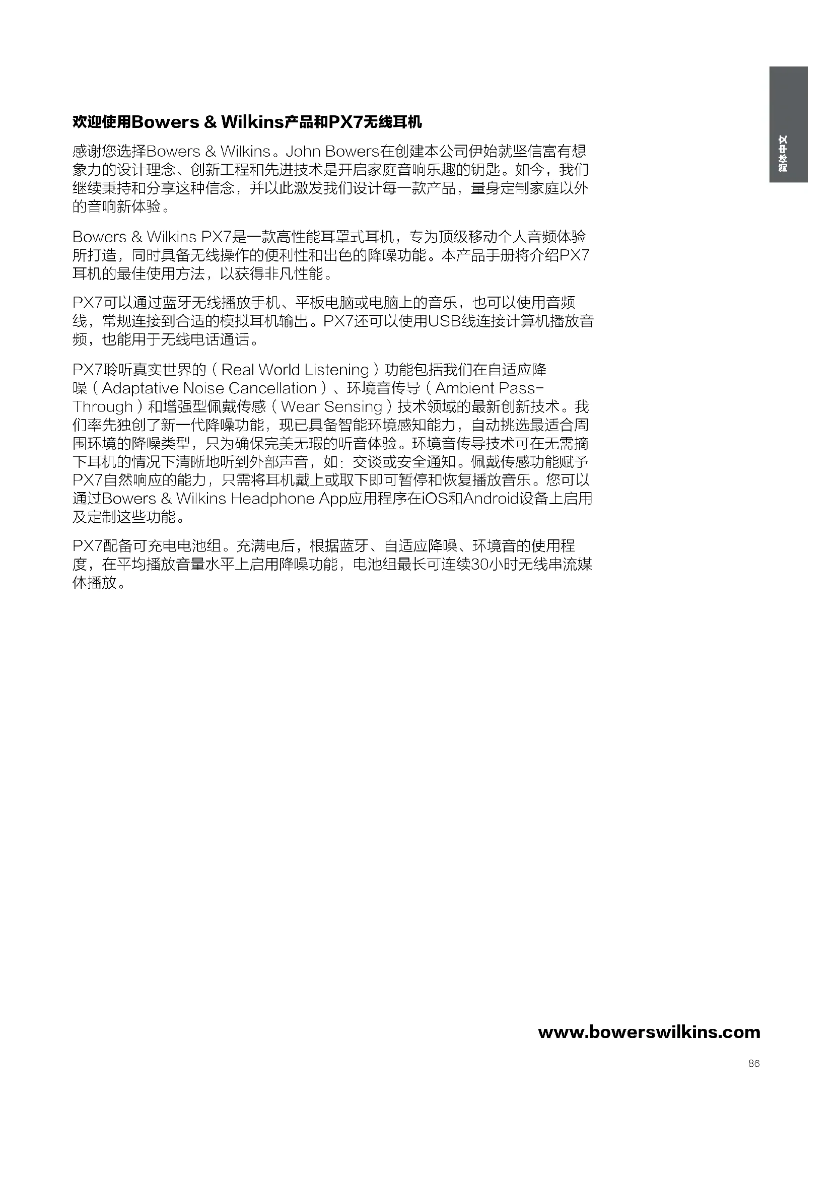 Bowers & Wilkins PX7是一款高性能耳罩式耳机,专为顶级移动个人音频体验 所打造,同时具备无线操作的便利性和出色的降噪功能。本产品手册将介绍PX7 耳机的最佳使用方法,以获得非凡性能。 PX7可以通过蓝牙无线播放手机、平板电脑或电脑上的音乐,也可以使用音频 线,常规连接到合适的模拟耳机输出。PX7还可以使用USB线连接计算机播放音 频,也能用于无线电话通话。 PX7聆听真实世界的(Real World Listening)功能包括我们在自适应降 噪(Adaptative Noise Cancellation)、环境音传导(Ambient Pass- Through)和增强型佩戴传感(Wear Sensing)技术领域的最新创新技术。我 们率先独创了新一代降噪功能,现已具备智能环境感知能力,自动挑选最适合周 围环境的降噪类型,只为确保完美无瑕的听音体验。环境音传导技术可在无需摘 下耳机的情况下清晰地听到外部声音,如:交谈或安全通知。佩戴传感功能赋予 PX7自然响应的能力,只需将耳机戴上或取下即可暂停和恢复播放音乐。您可以 通过Bowers & Wilkins Headphone App应用程序在iOS和Android设备上启用