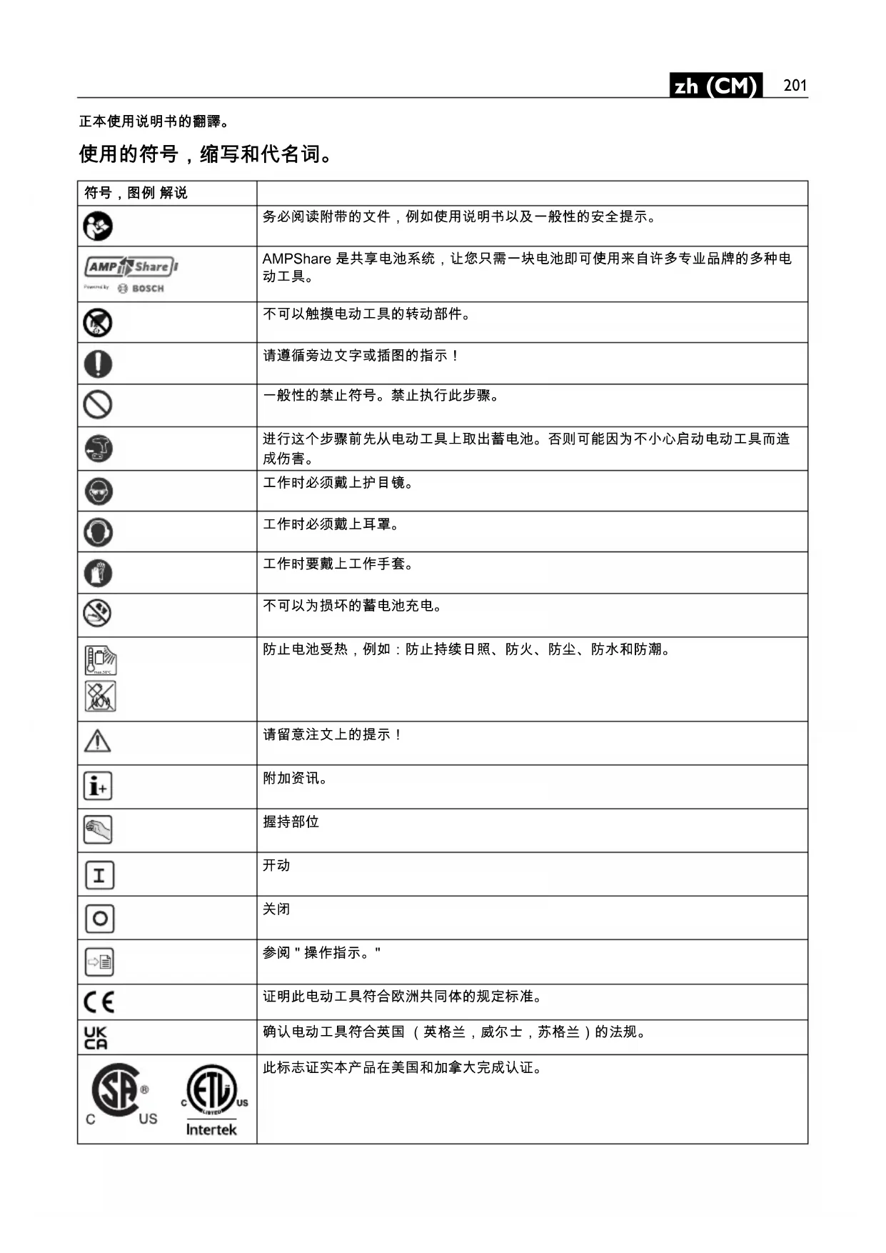 参阅 " 操作指示。" 证明此电动工具符合欧洲共同体的规定标准。 确认电动工具符合英国 (英格兰,威尔士,苏格兰)的法规。 此标志证实本产品在美国和加拿大完成认证。 max.50°C202 zh (CM) 已确认该电动工具符合欧亚关税同盟 (白俄罗斯、俄罗斯、吉尔吉斯斯坦、哈萨克斯 坦和亚美尼亚)的国家技术法规。 本提示指出潜伏的危险状况。它们可能导致严重的伤害甚至造成死亡。 回收图案:标明可以再利用的物料 分开收集损坏的电动工具,电子和电动产品,並且以符合环保要求的方式回收可利用