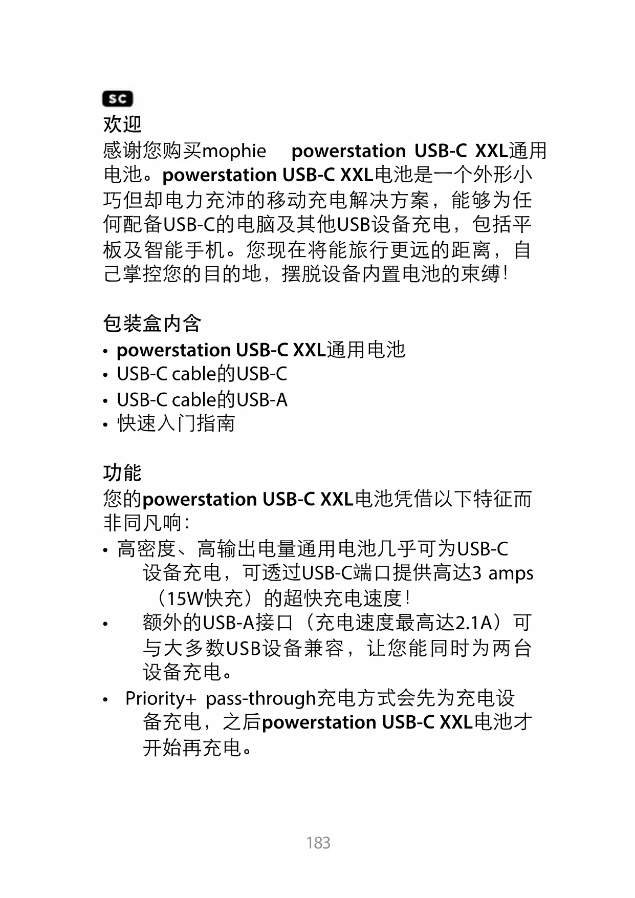 感谢您购买mophie powerstation USB-C XXL通用电池。powerstation USB-C XXL电池是一个外形小巧但却电力充沛的移动充电解决方案,能够为任何配备USB-C的电脑及其他USB设备充电,包括平板及智能手机。您现在将能旅行更远的距离,自己掌控您的目的地,摆脱设备内置电池的束缚!
