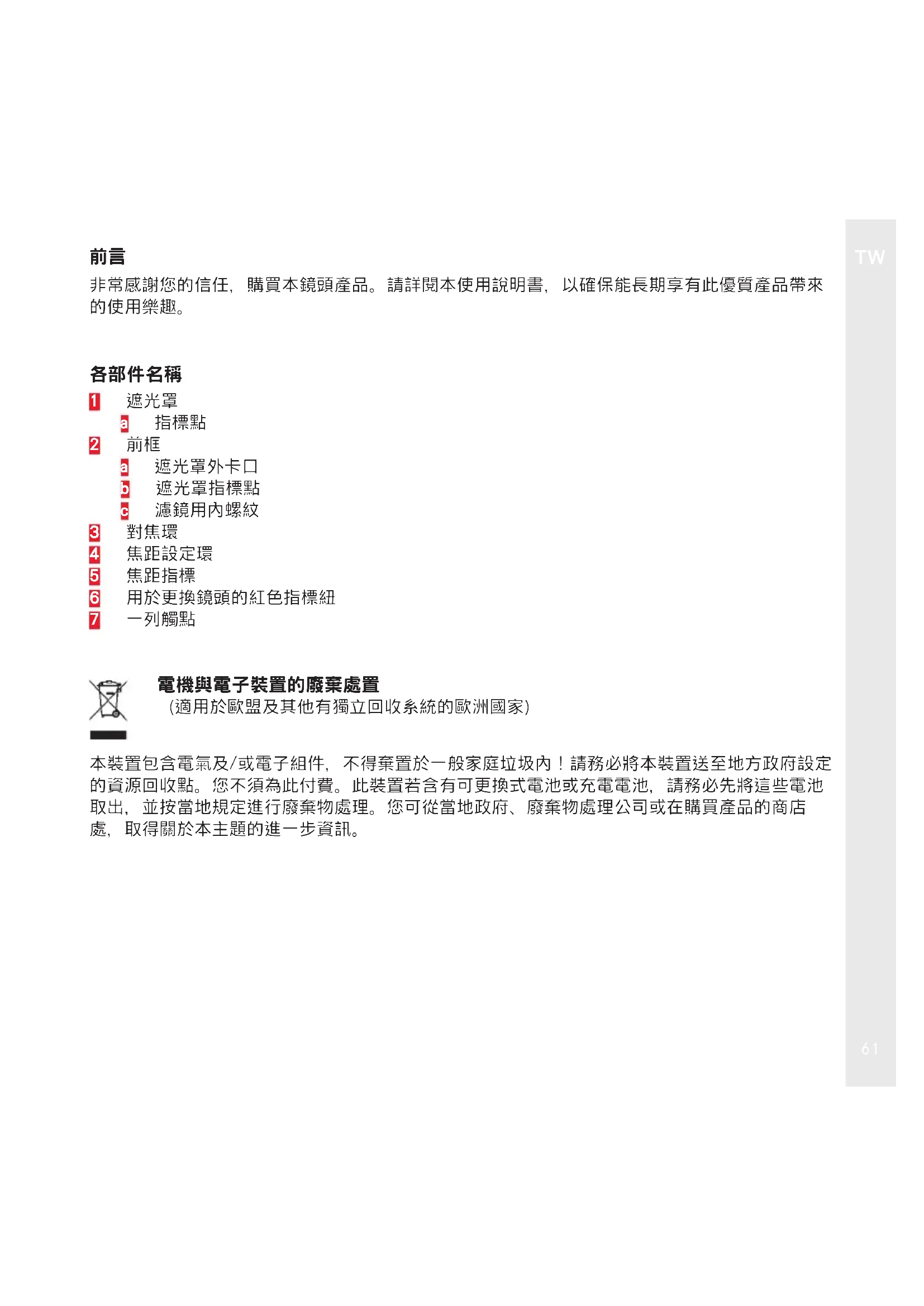 1 遮光罩 a 指標點 2 前框 a 遮光罩外卡口 b 遮光罩指標點 c 濾鏡用內螺紋 3 對焦環 4 焦距設定環 5 焦距指標 6 用於更換鏡頭的紅色指標紐 7 一列觸點 電機與電子裝置的廢棄處置 (適用於歐盟及其他有獨立回收系統的歐洲國家) 本裝置包含電氣及/或電子組件,不得棄置於一般家庭垃圾內!請務必將本裝置送至地方政府設定 的資源回收點。您不須為此付費。此裝置若含有可更換式電池或充電電池,請務必先將這些電池 取出,並按當地規定進行廢棄物處理。您可從當地政府、廢棄物處理公司或在購買產品的商店 處,取得關於本主題的進一步資訊。