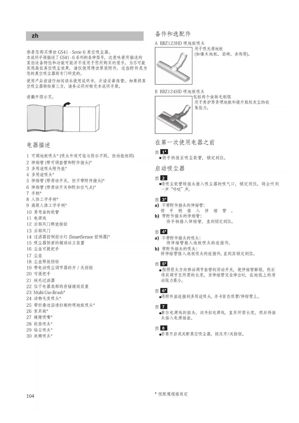 恭喜您购买博世 GS41 - Serie 6 真空吸尘器。 本说明手册描述了 GS41 - 6 系列的各种型号,这意味着所描述的 某些设备特性和功能可能并不适用于您所购买的型号。为尽可能 实现最佳真空吸尘效果,请仅使用博世原装附件,这些附件是为 您的真空吸尘器而专门研发的。 使用产品前请仔细阅读本使用说明书,并请妥善保管。如果将真 空吸尘器转给第三方,请务必同时转交本说明手册。