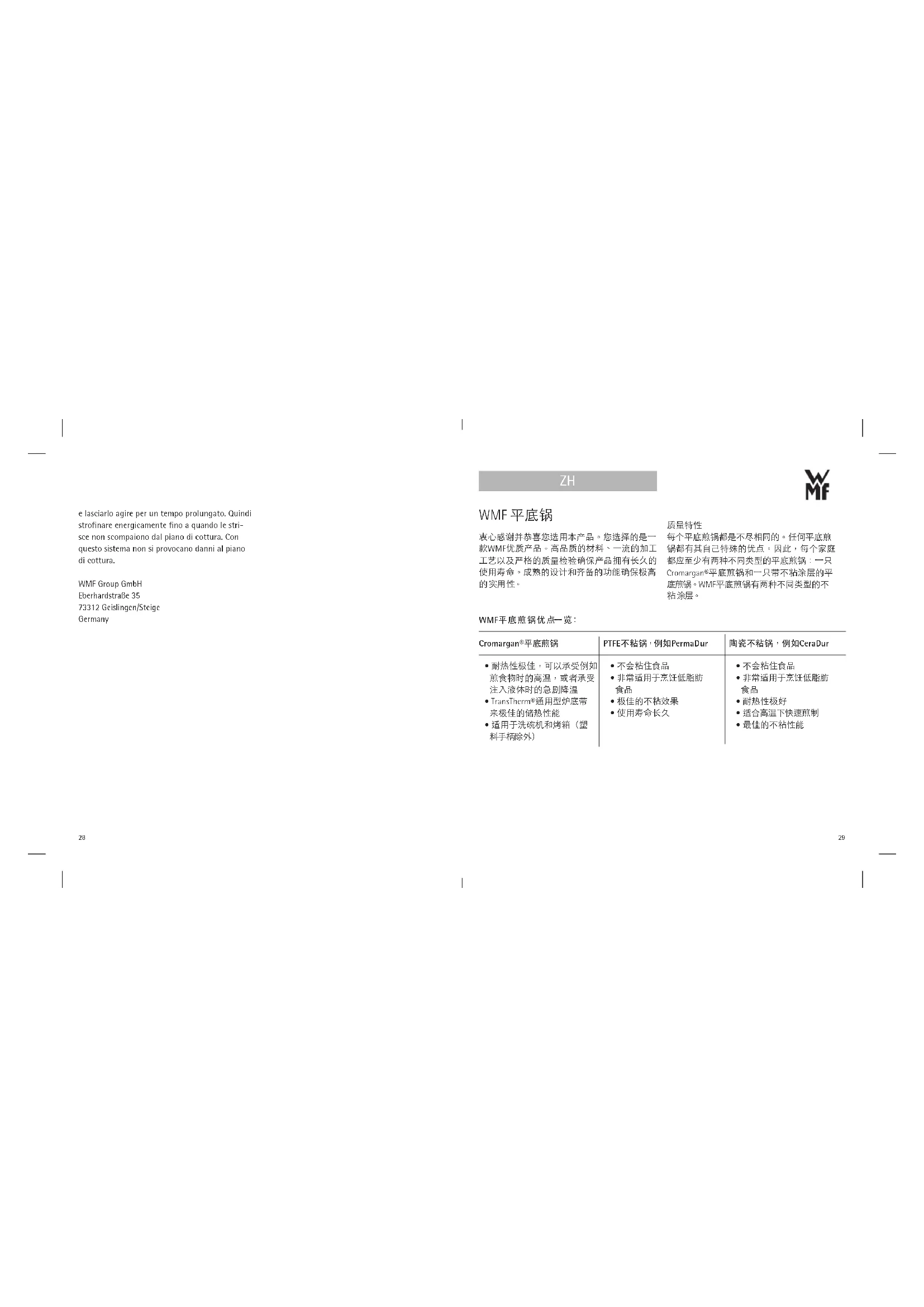如果想知道您的平底煎锅是否适用于电磁炉, 请查看外包装上或者锅底的炉灶类型图标。 请注意。电磁炉是一种加热极快的热源。不要 空锅加热,因为一旦过热,则可能损坏锅具。在 高挡火候下可能产生蜂鸣噪音。这种噪音的产 生是由于技术受限,并不表明您的灶具或锅具 出现故障。锅的底部直径与烹饪感应区的大小 必须相吻合,否则存在感应区(磁场)无法识别 到 锅 底 的 可能 性。 陶瓷炉和玻璃陶瓷炉上的使用指南 为了避免在玻璃陶瓷炉的表面出现不必要的刮 擦,请您不要在炉面上推拉锅具。 在带凸起装饰花纹的玻璃陶瓷炉灶上使用铝制 平底煎锅时,炉灶表面可能会出现金属材料刮 落的条纹痕迹,这可用简单的方法清除。您可 在炉面上喷洒烤箱清洗剂,浸泡一段较长的时 间。然 后用力摩 擦 炉 面,直 至 痕 迹 消 失为止。您 的玻璃陶瓷炉不会因此而受损。 WMF Group GmbH Eberhardstraße 35 73312 Geislingen/Steige Germany