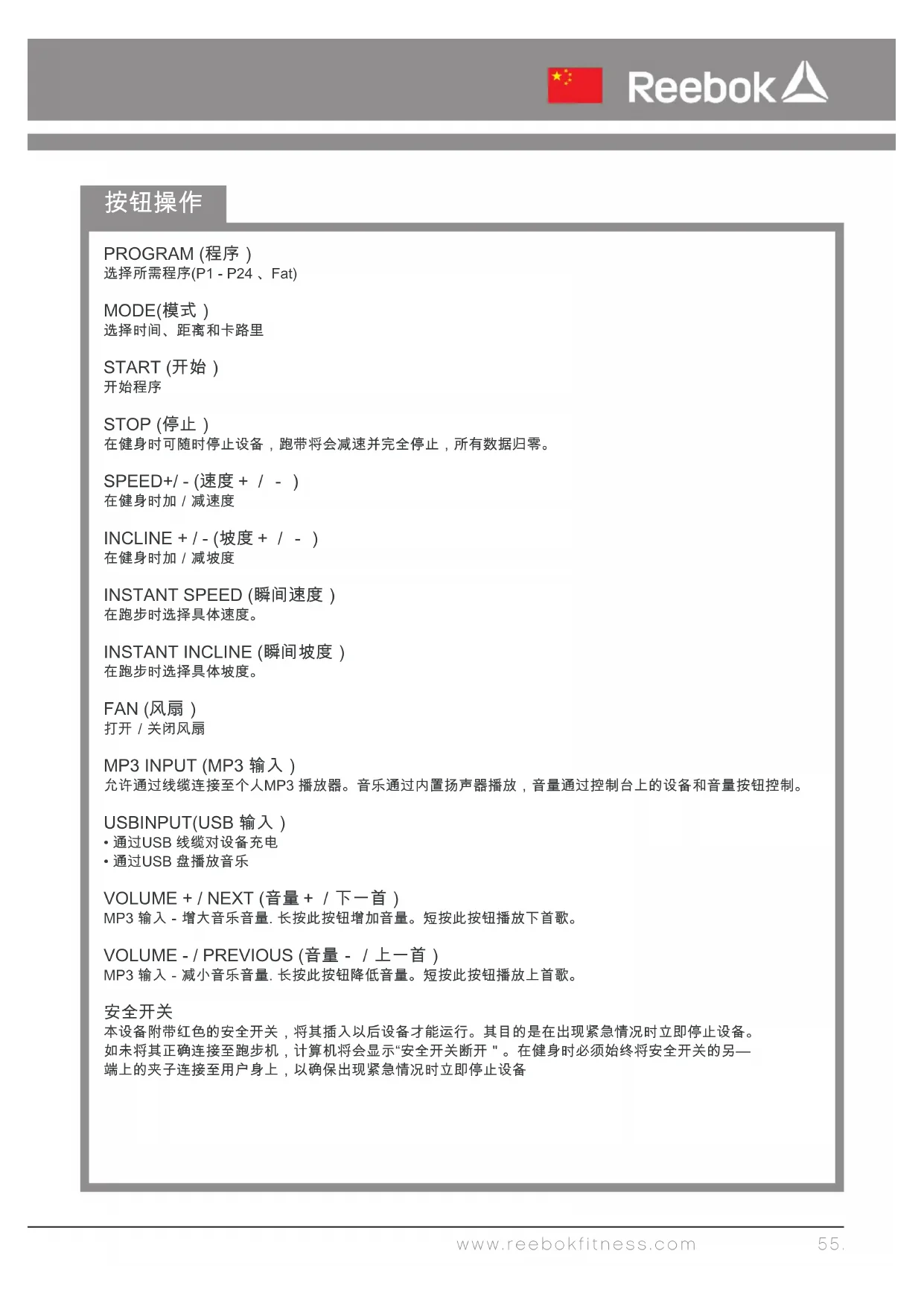 3. 这些程序的默认健身时间为10 分钟。在选择"START (开始)“以前,可以按下"坡度+/-”按钮进行更改。www.reebokfitness.com 57.