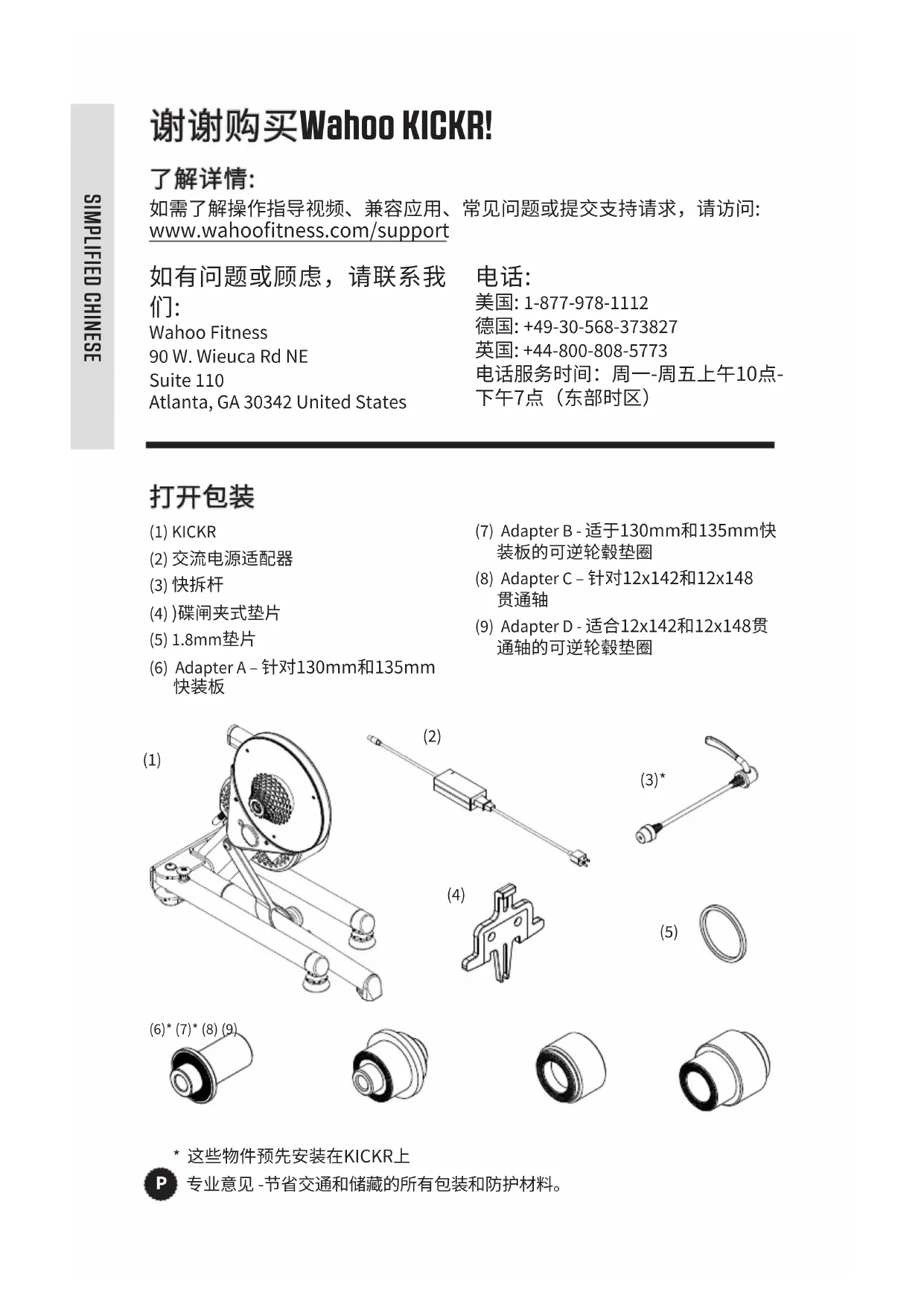 (3) (4)Adapter A 130mm Configuration (Adapter B)135mm Configuration (Adapter B) 针对130MM或135MM快装板 Adapters Needed: A and B KICKR自带已为自行车预先配置好的130mm快装板垫圈,直接脱箱可用。如果您有 130mm垫圈的自行车,请转到”连接您的自行车”。针对135mm垫圈,取下快拆杆,反 向换动Adapter B并重新安装快拆杆。 SIMPLIFIED CHINESE30 使用WAHOO FITNESS应用完成设置 自动转速减速-首次使用KICKR前应进行自动转速减速校正设备。此外,自动转速减 速约每两周应通过Wahoo Fitness应用重复一次,以此确保最准确的功率数据。 开始锻炼-从锻炼屏幕选择绿色”开始”按扭开始锻炼。右滑可查看KICKR页面。该页 可查看您的锻炼并控制KICKR。 KICKR锻炼模式- Wahoo Fitness应用有以下锻炼模式,能用于控制您的KICKR: LEVEL: 就像骑在