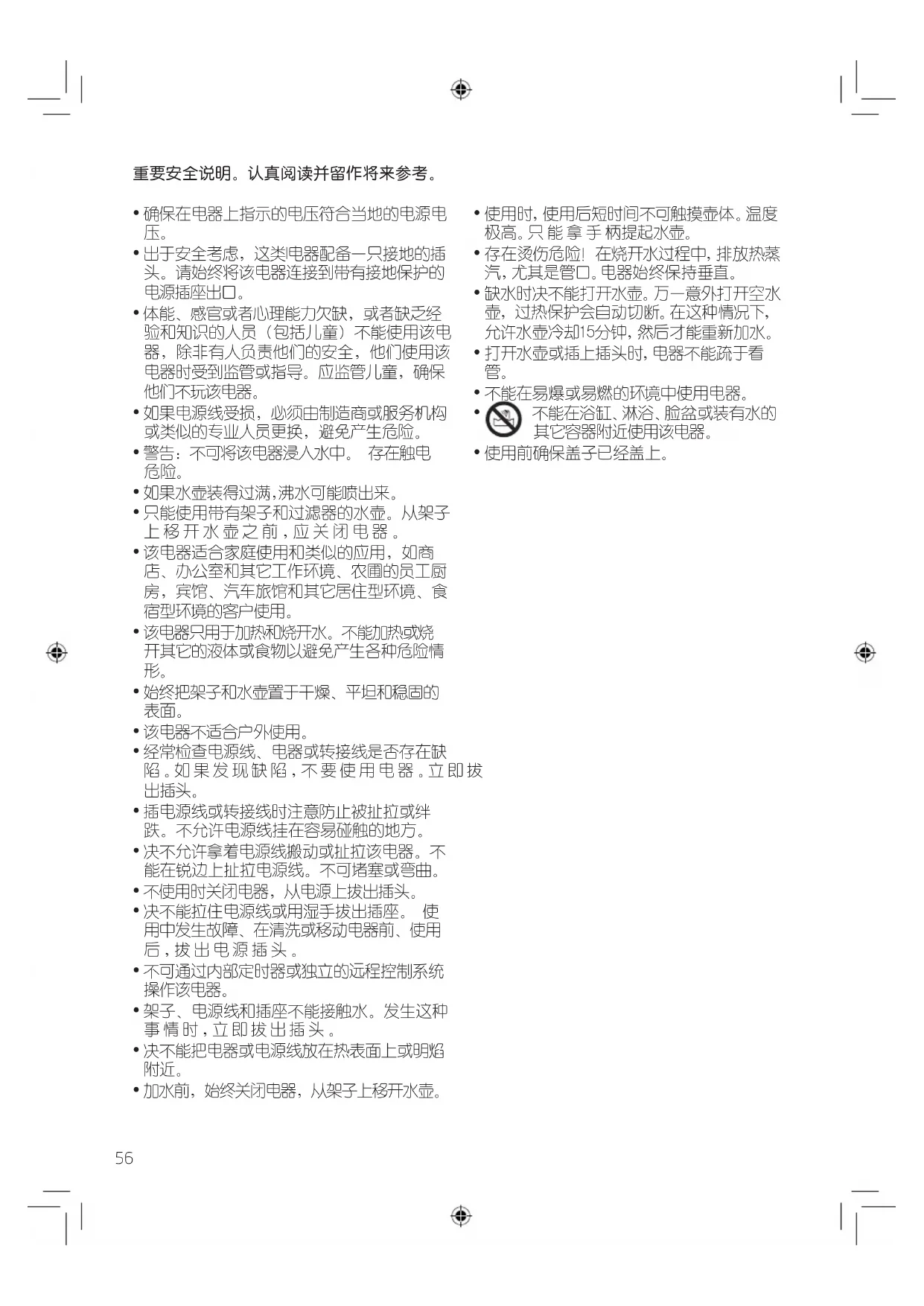 - 警告: 不可将该电器浸入水中。 存在触电